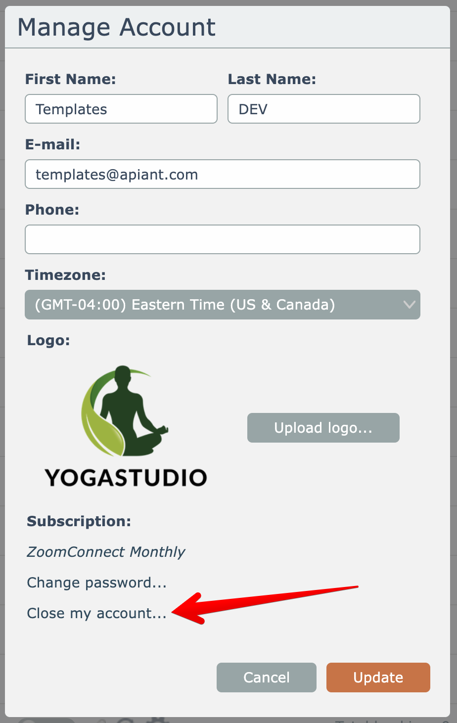 To close your account and cancel your subscription, open the Manage account menu option found under your account name menu at the top right: