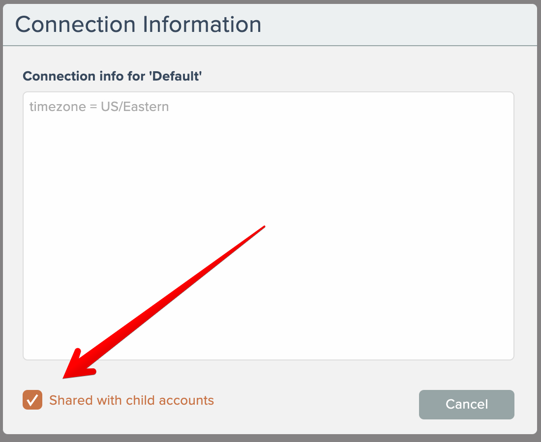 Parent accounts having linked child accounts will see a checkbox for sharing the connection. Checking it will make it available to all linked child accounts: