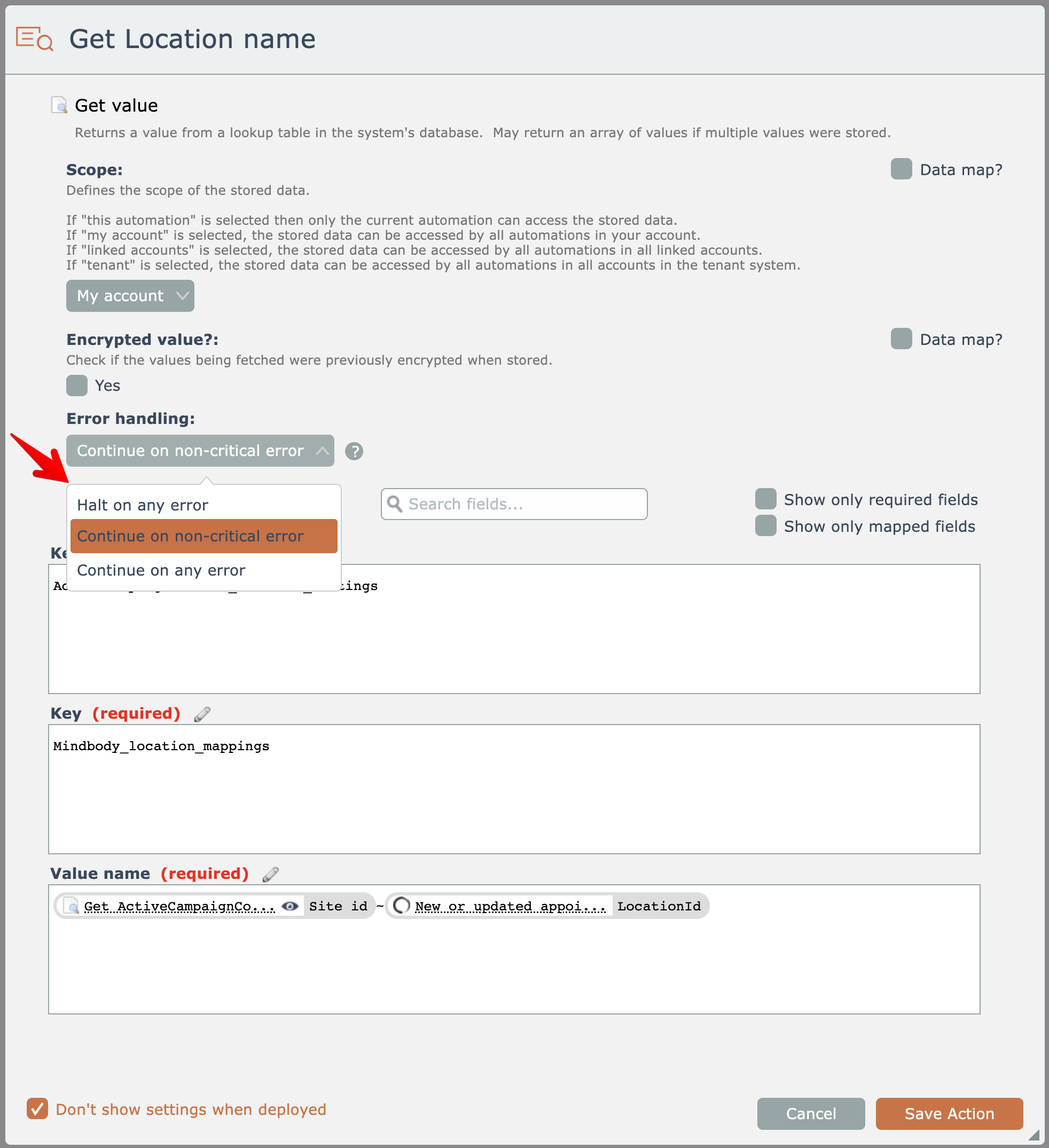Each action can be configured to handle errors conditions via the error handling dropdown: