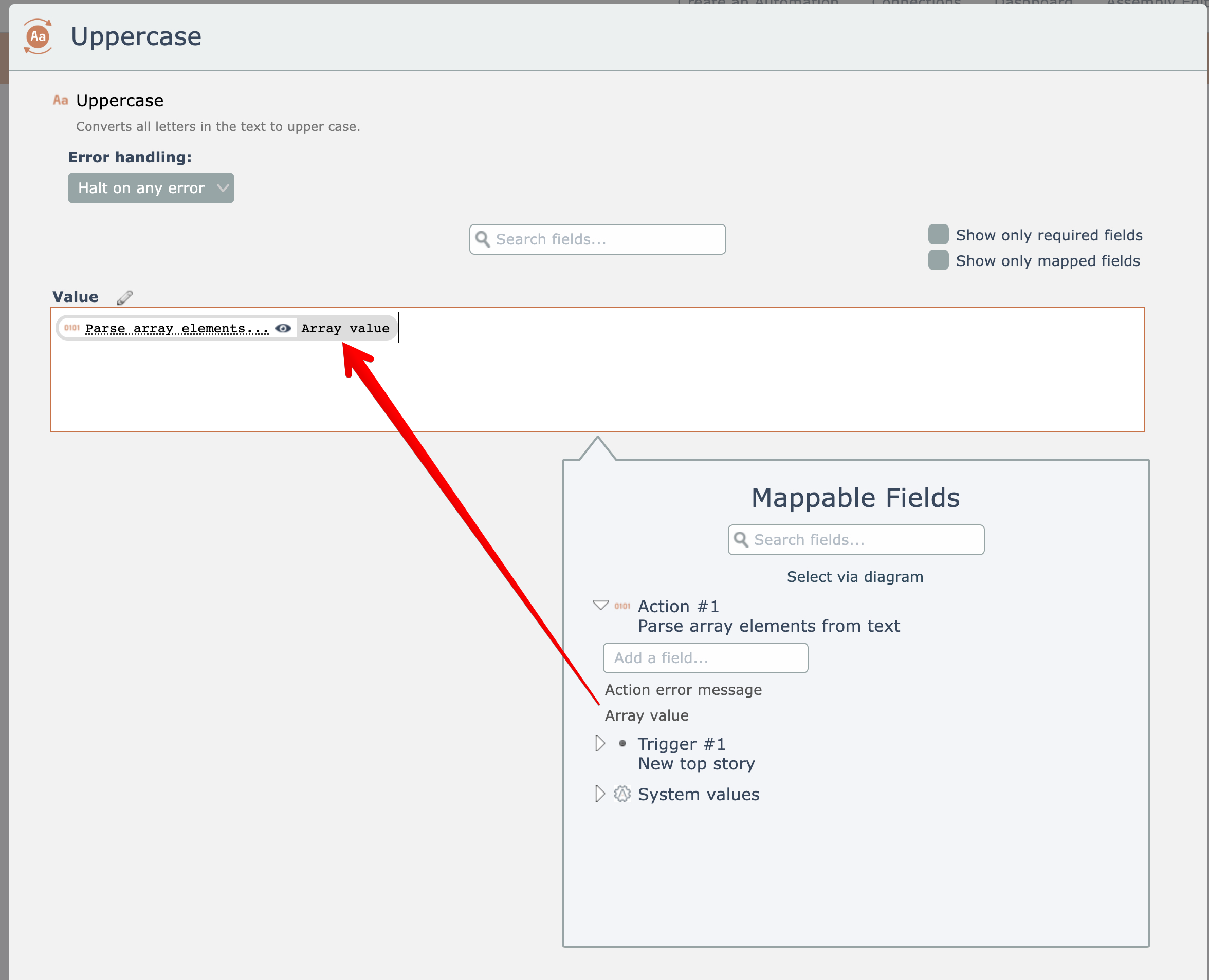 The input value to uppercase will be the array output from the first action: