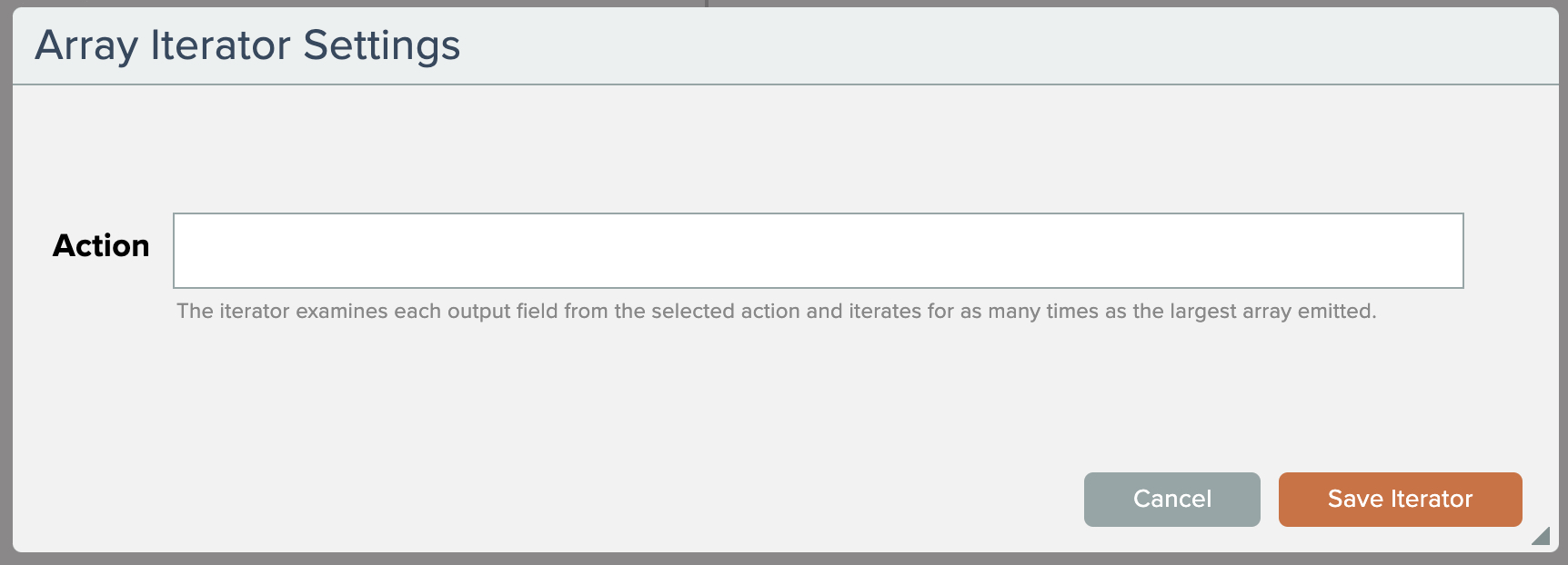 Array iterators are unlike programming loops in that there is no variable with a starting value being incremented until an ending value or criteria is met. Iteration is performed for as many times as the largest array emitted by action configured for iteration.