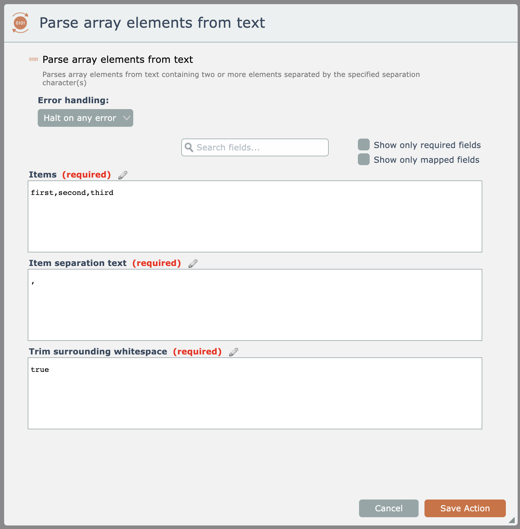 Let's walk through a simple example. We will use this action to emit an array of 3 values consisting of 'first', 'second', and 'third':