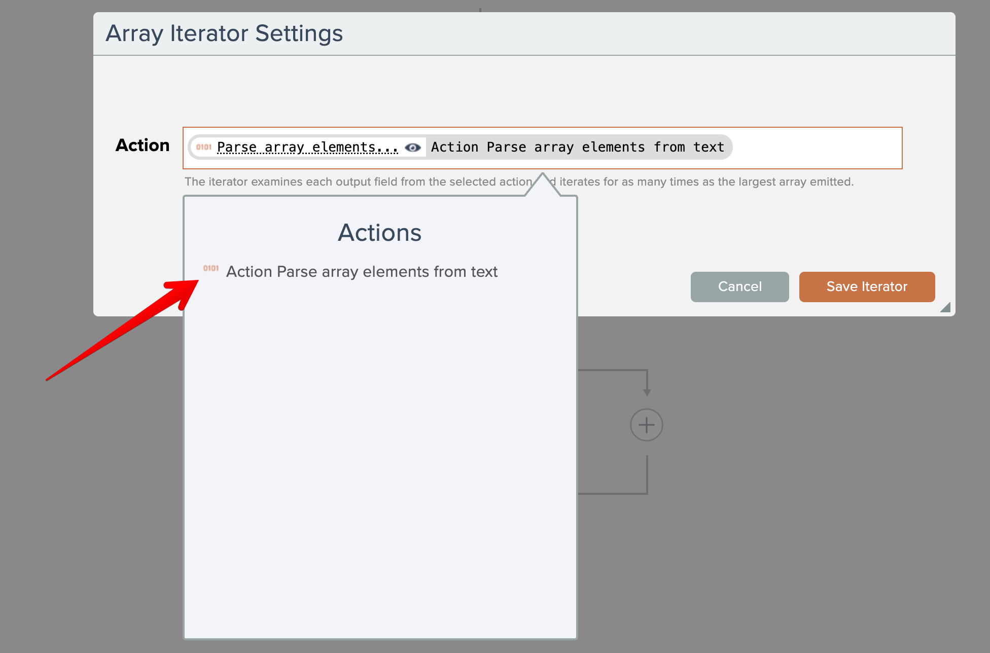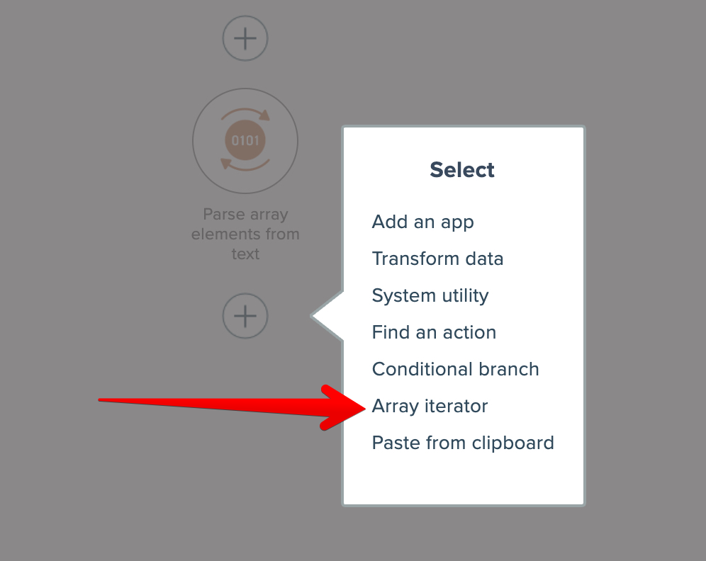 Array iterators are added by clicking on a "plus" icon and choosing the option: