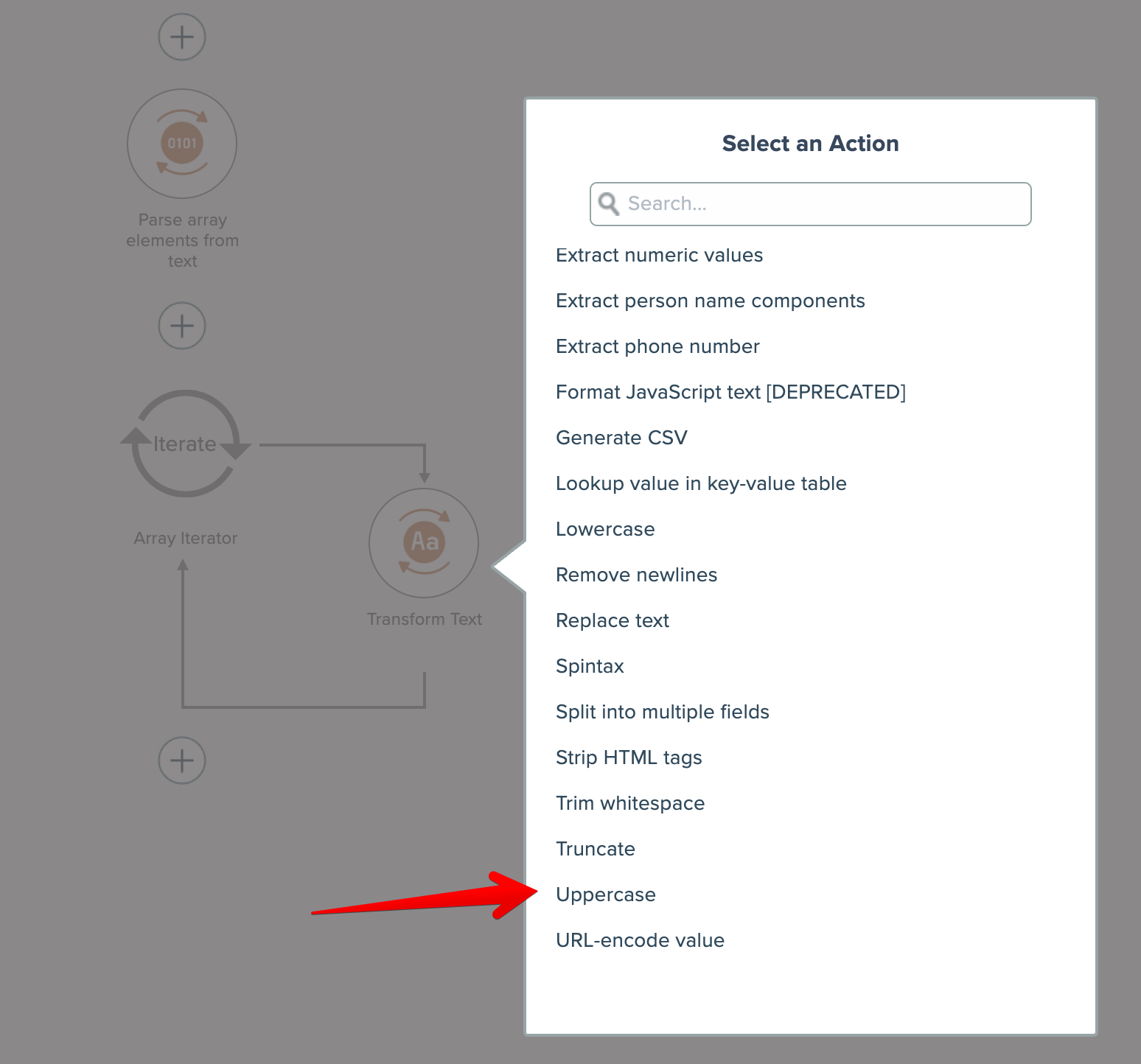 Within the iterator we'll add a Transform Data action convert those three array elements to uppercase: