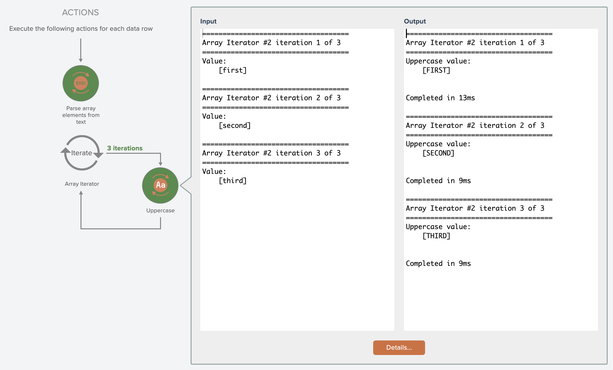 When the automation runs, the Array Iterator makes 3 iterations and uppercases the output from the first action: