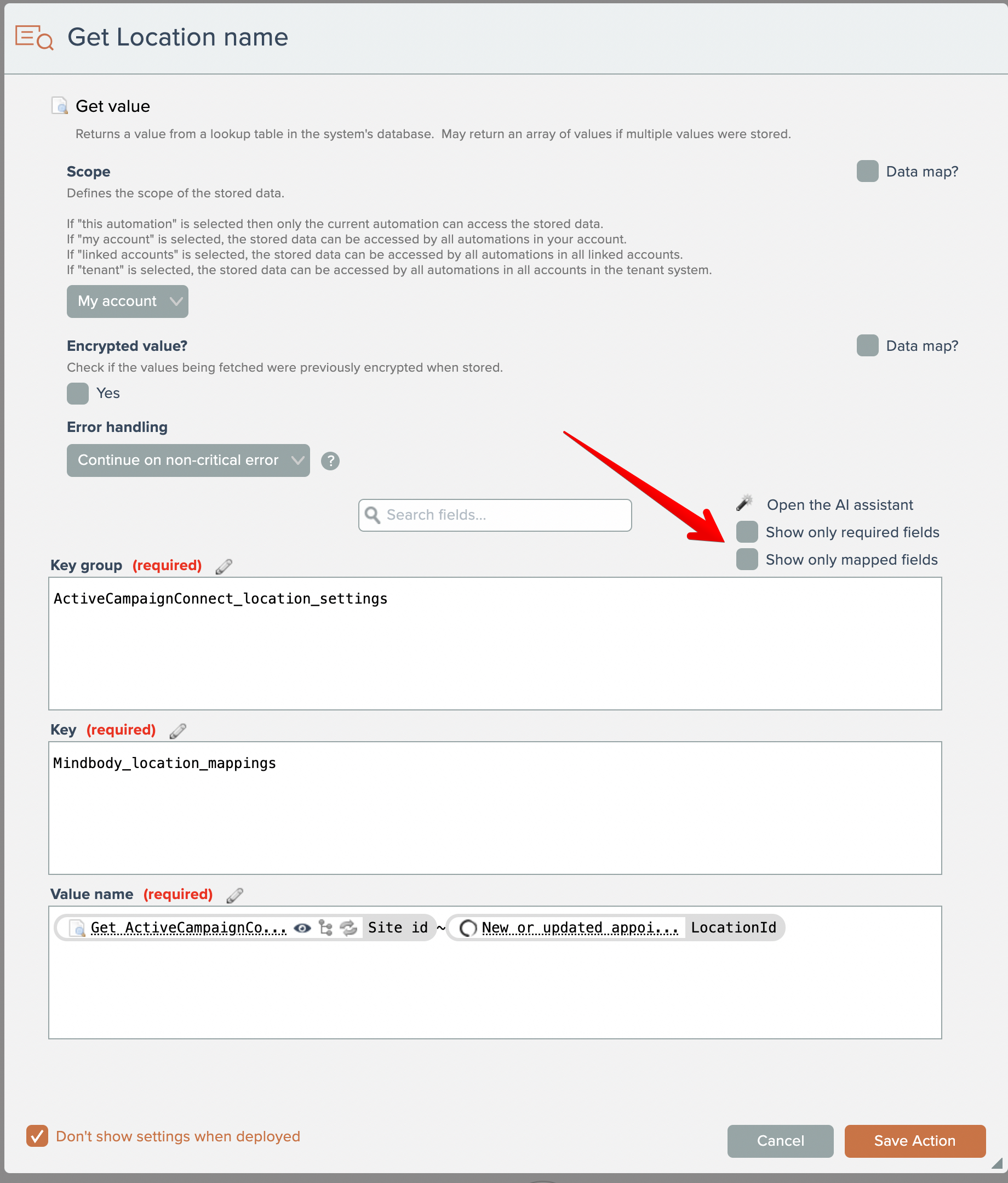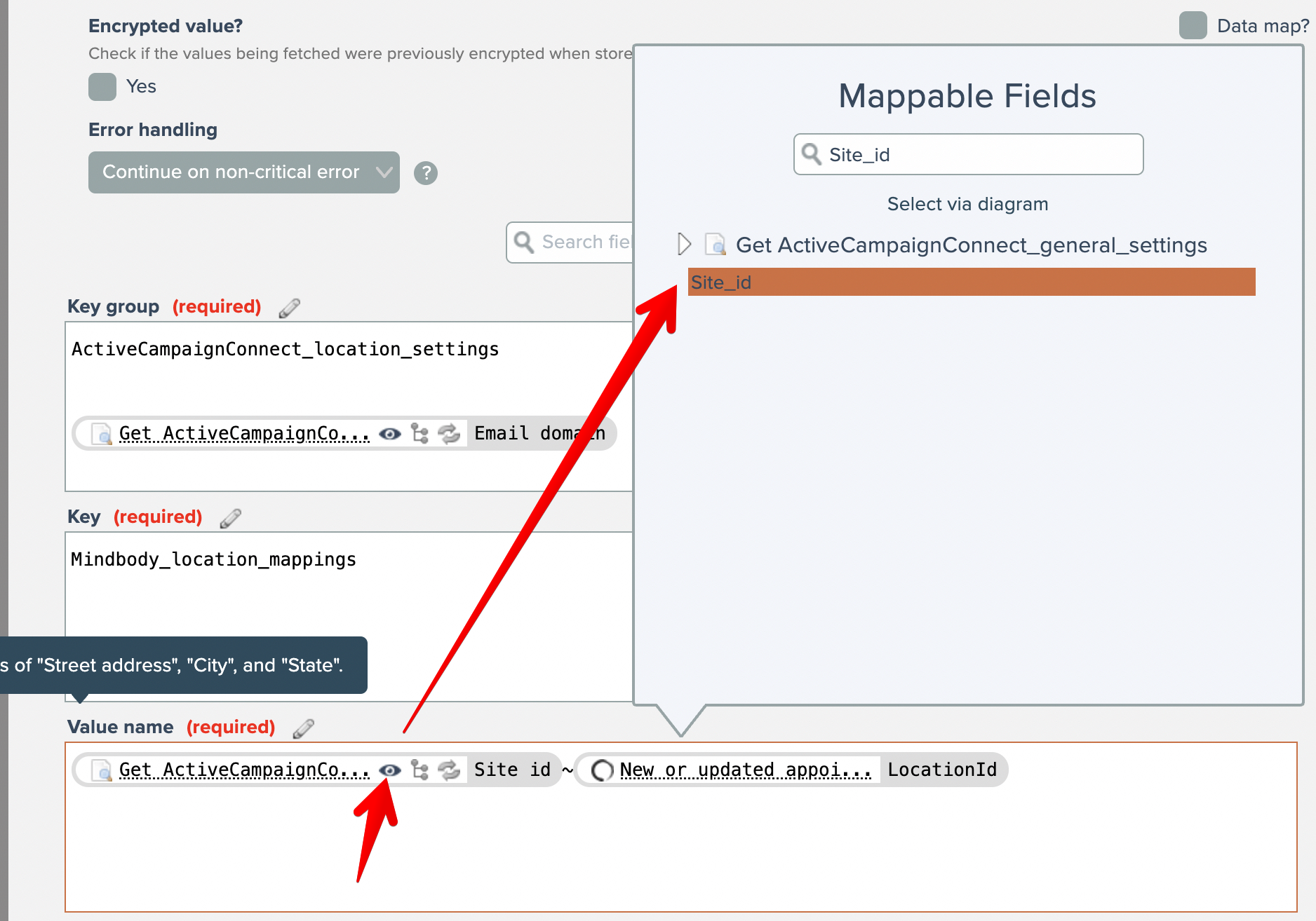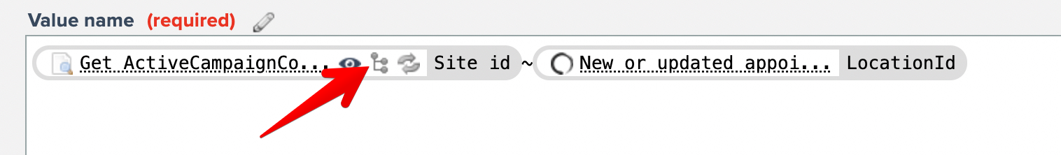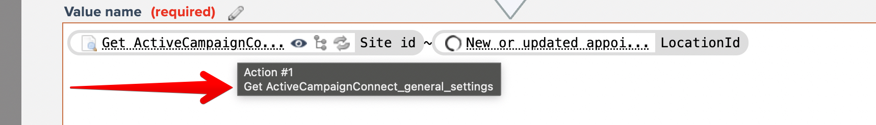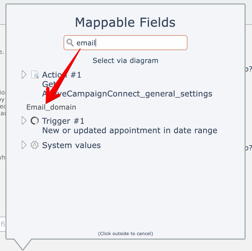 Clicking the "eye" icon that appears next to mapped action fields will reveal the field in the popup list: