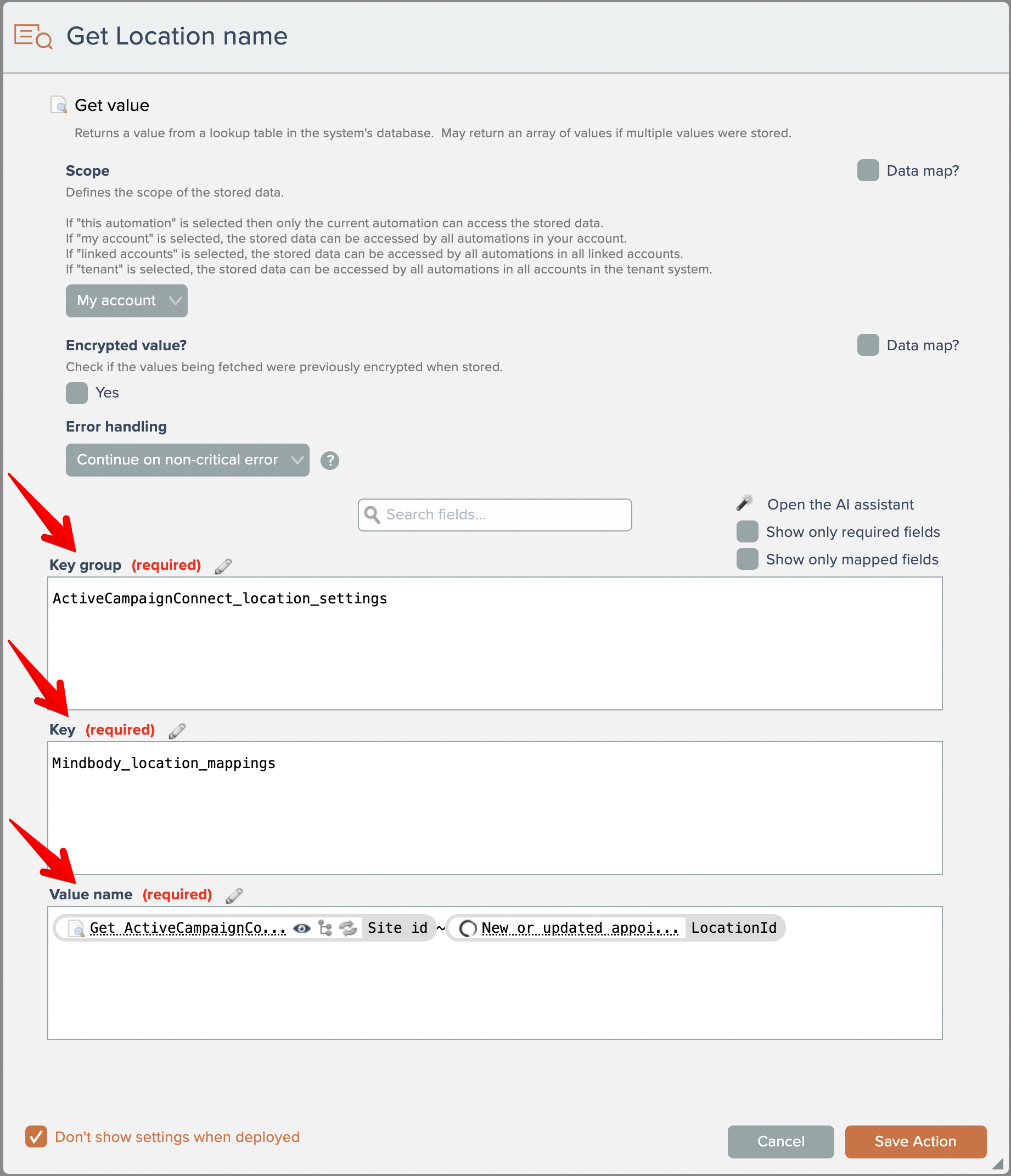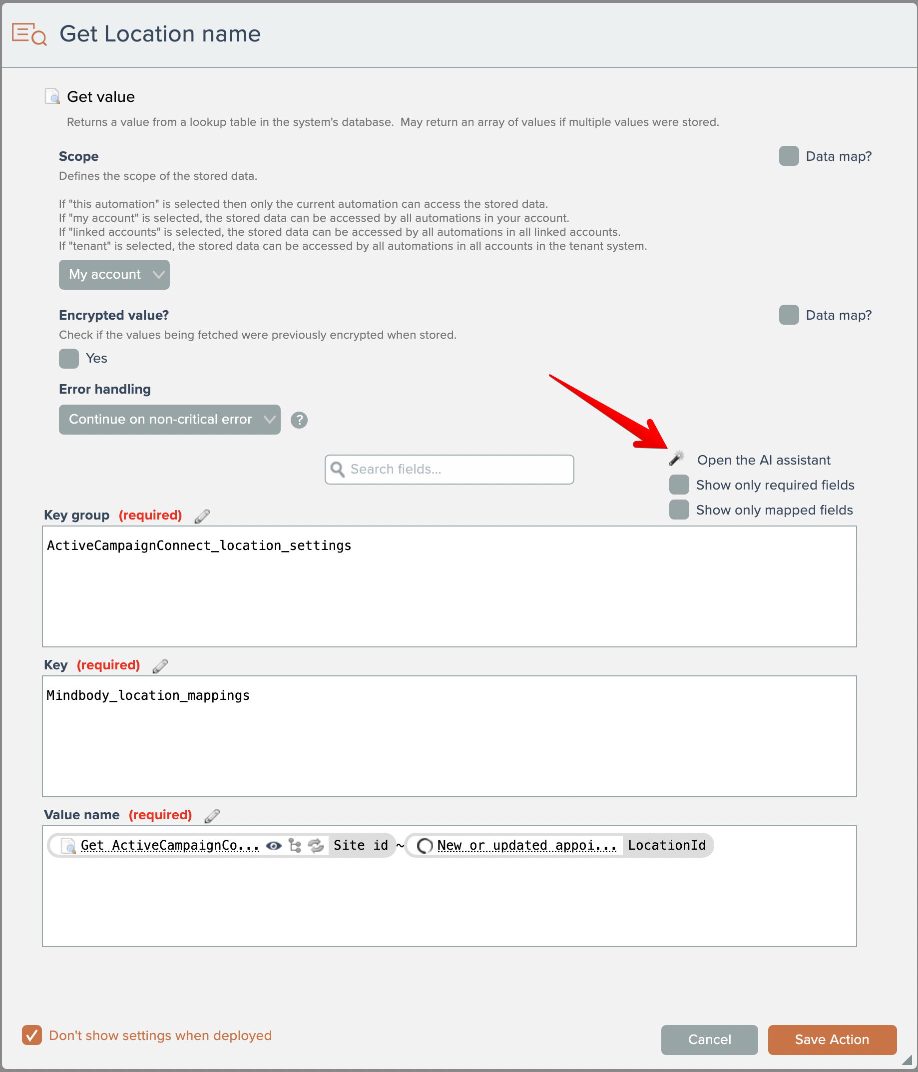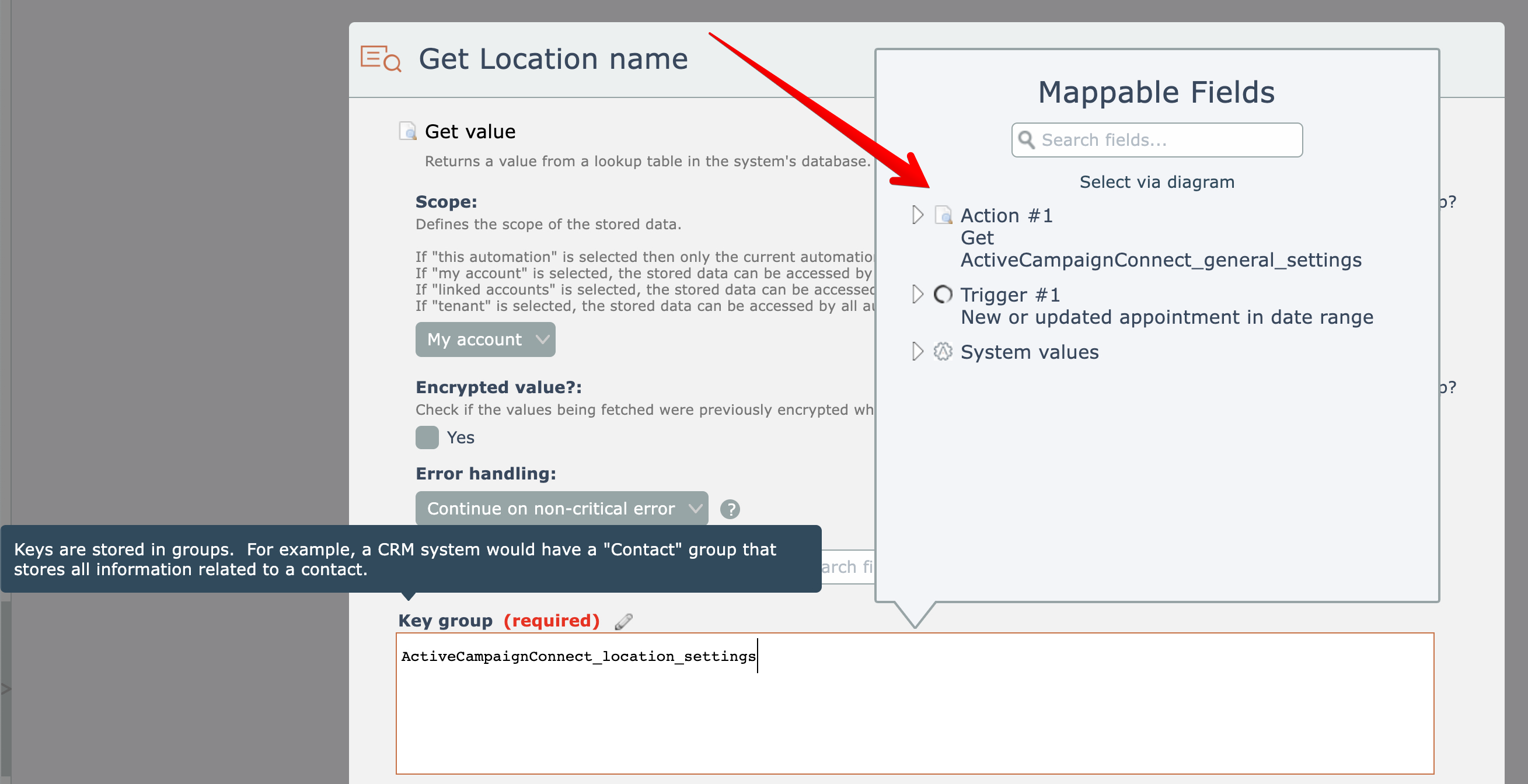 Clicking the "eye" icon that appears next to mapped action fields will reveal the field in the popup list:
