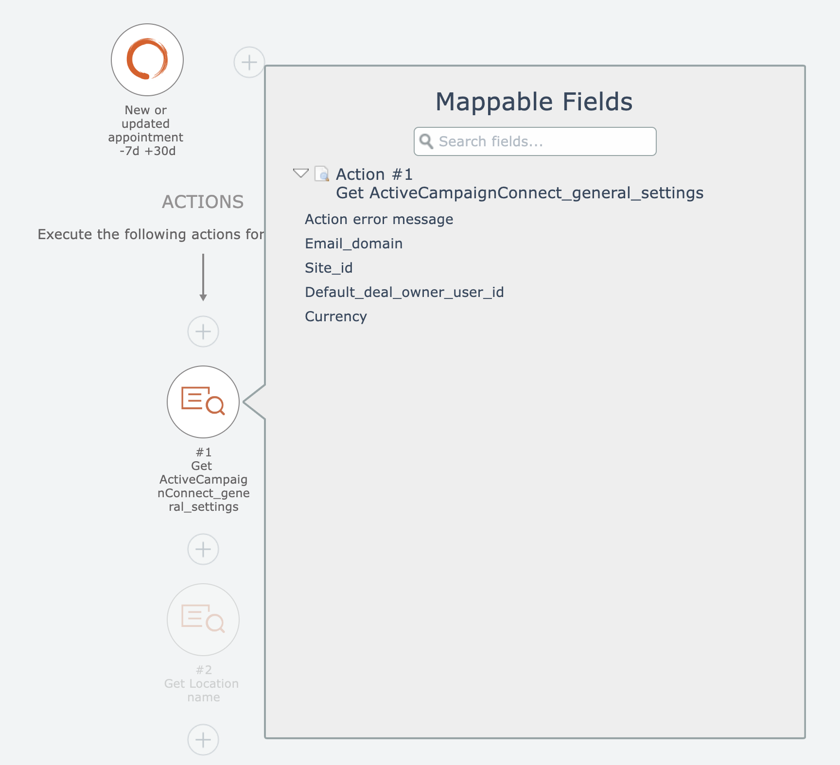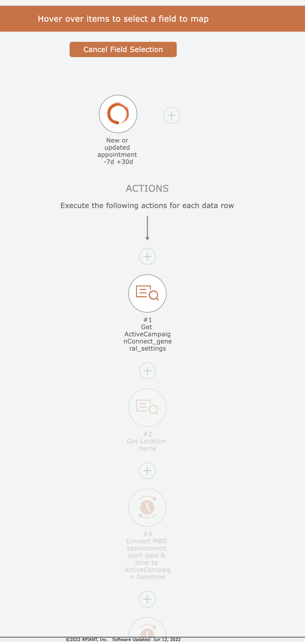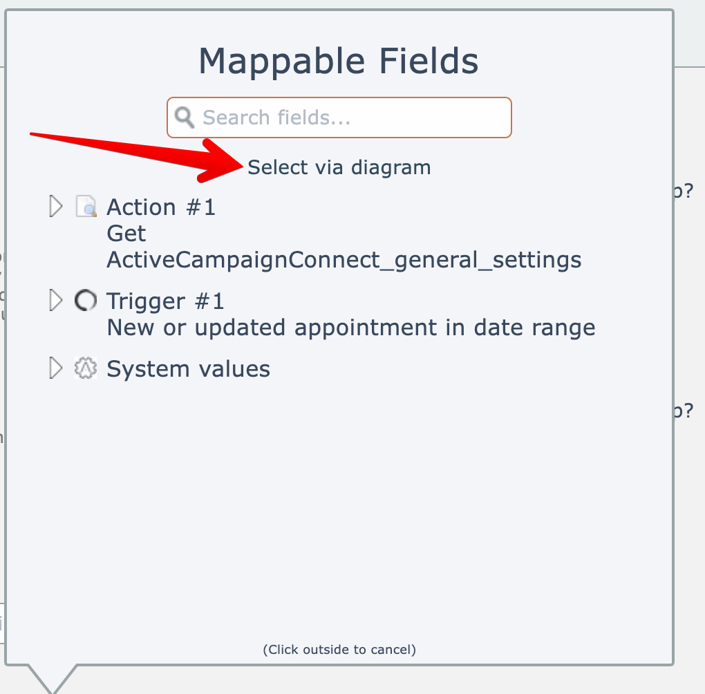 The automation diagram will appear. Only actions and triggers that precede the item are enabled for selection, since only those emit output that can be mapped into the field: