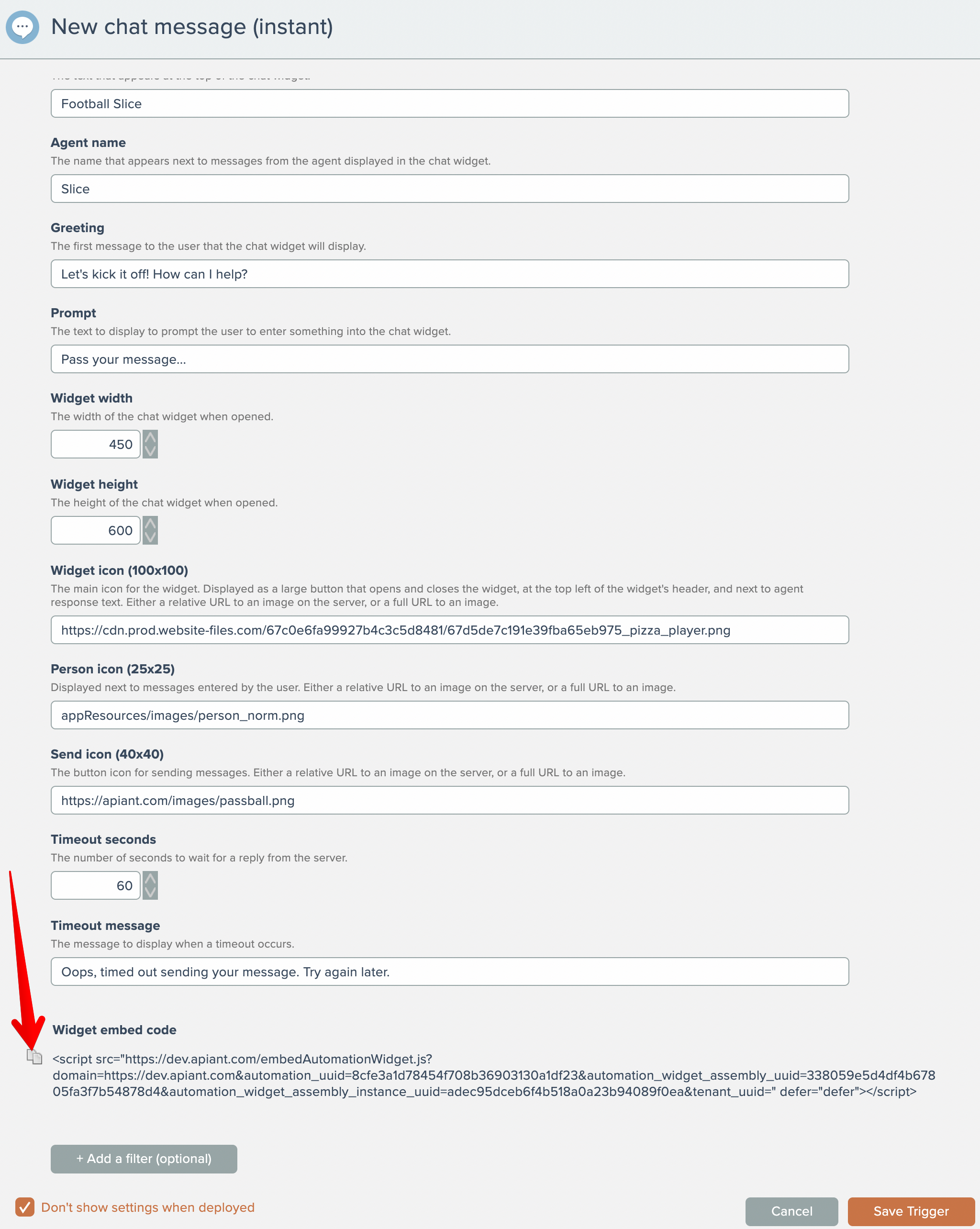 Be sure to scroll all the way down the settings, where the widget's embed code appears: