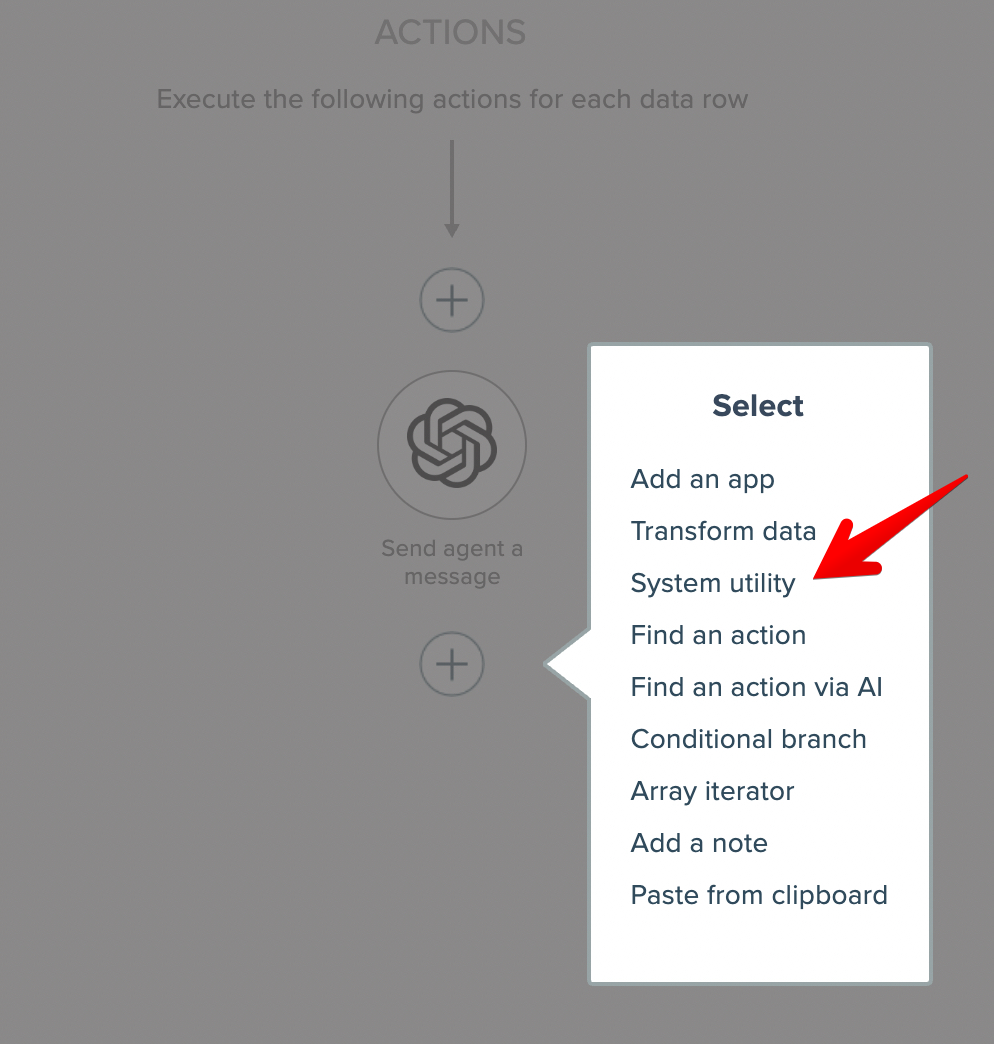 To send the AI model's response back to the chat widget, start by adding an action and select "system utility":
