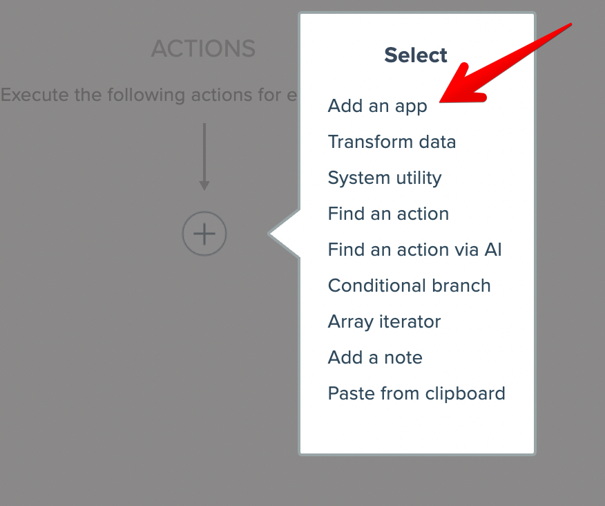 The brain of the chatbot is the AI model that responds to the chat widget user's prompts. Start by adding an action and choose to add an app: