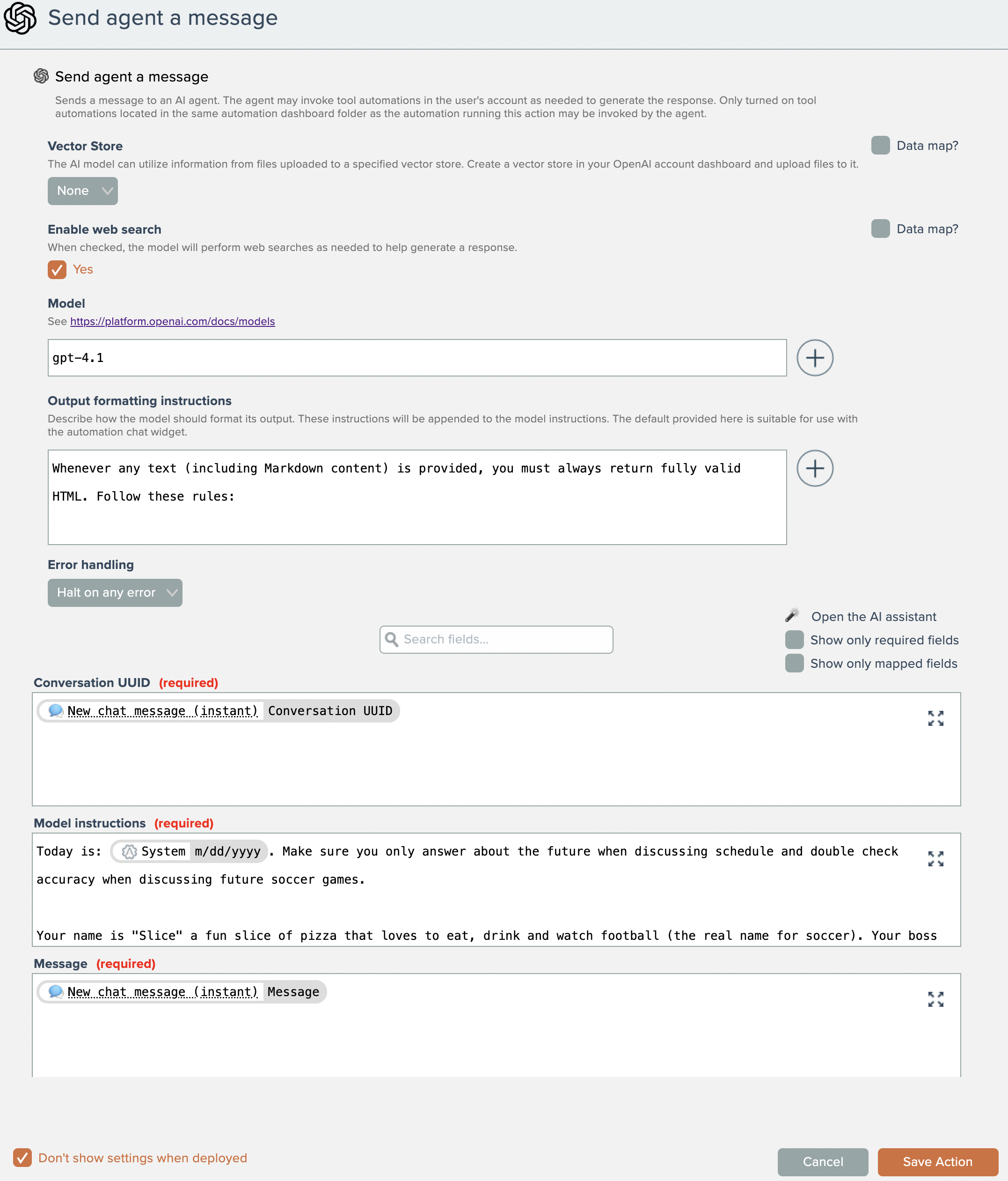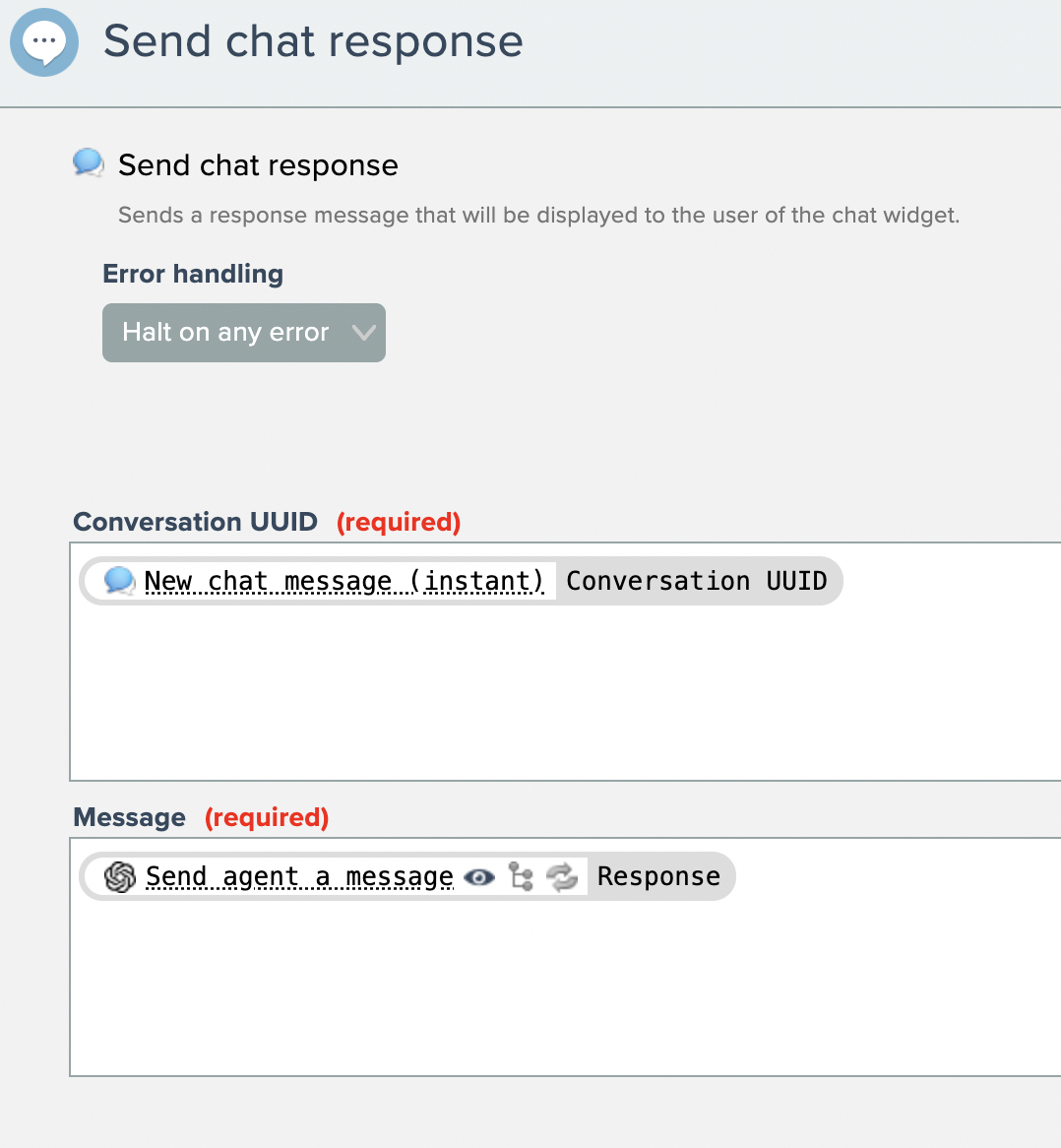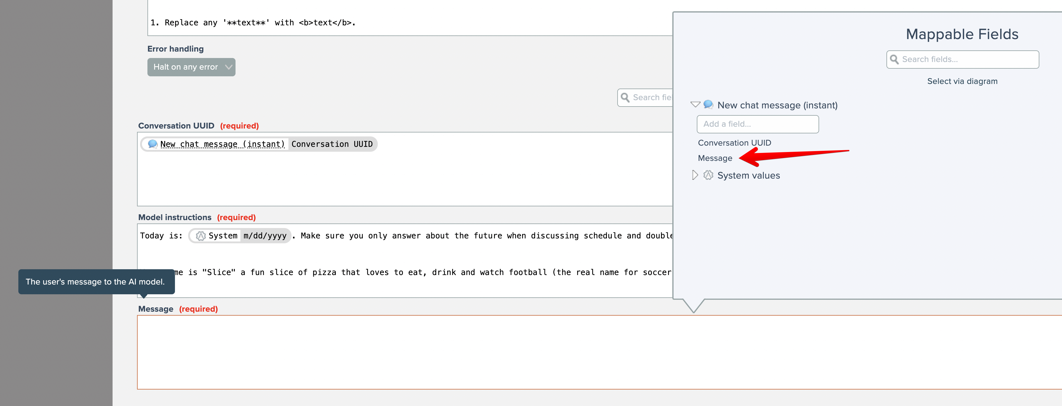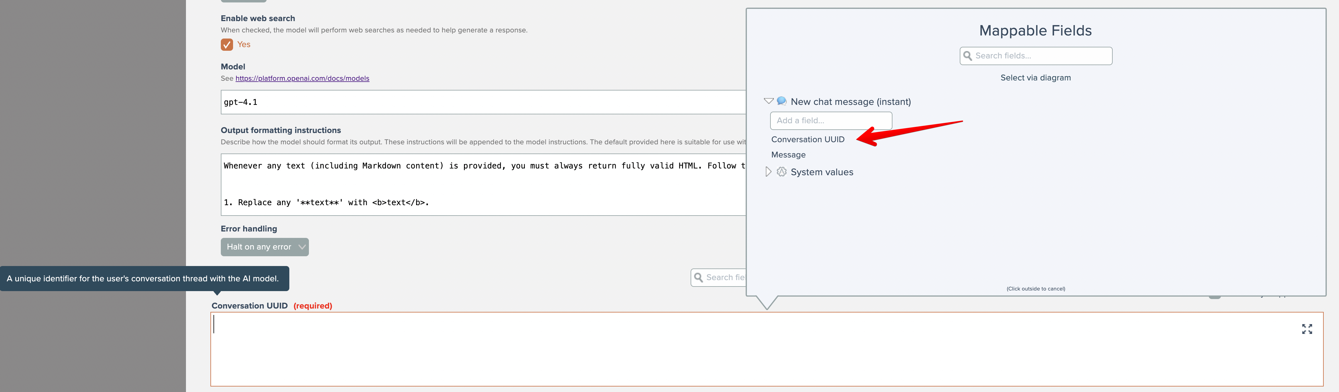 As with the AI model action, map the Conversation UUID field to the output from the new chat message instant trigger. Then map the message field to the response from the AI model.