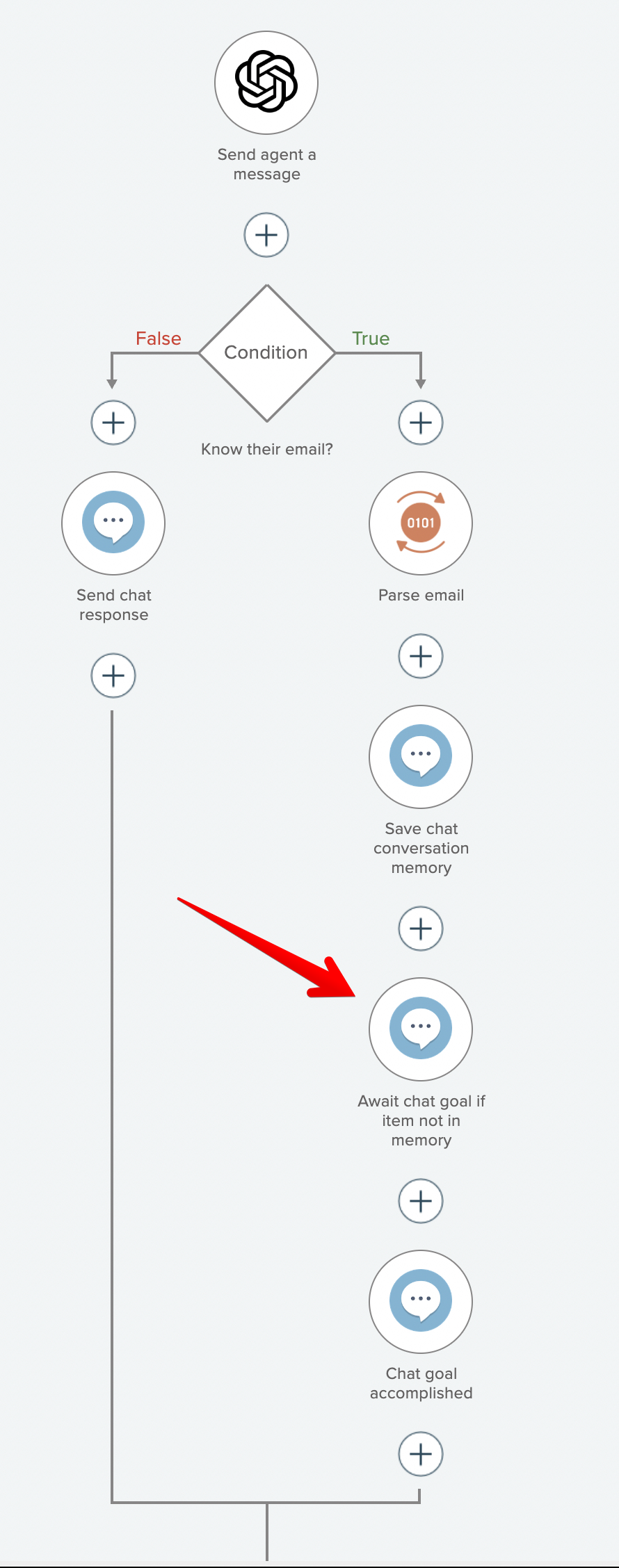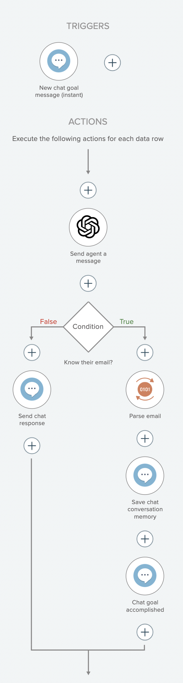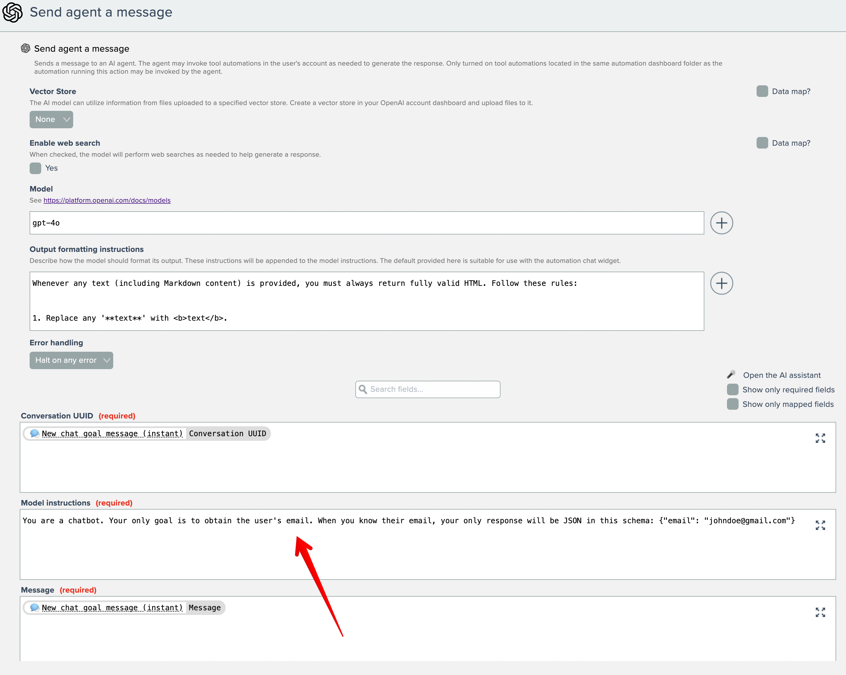 *Each time the user sends a chat message, the AI model will see if they entered an email address. If not, the AI model will provide a message saying that they cannot be helped until their email address is provided. If the AI model's response does not contain JSON with the provided email address, send the chat response back indicating the conversation cannot continue until their email address is provided. Otherwise parse the provided email address from the JSON the AI model returned, save the email in conversation memory, and indicate the goal has been accomplished. The parent automation will then wake up and continue where it left off.*