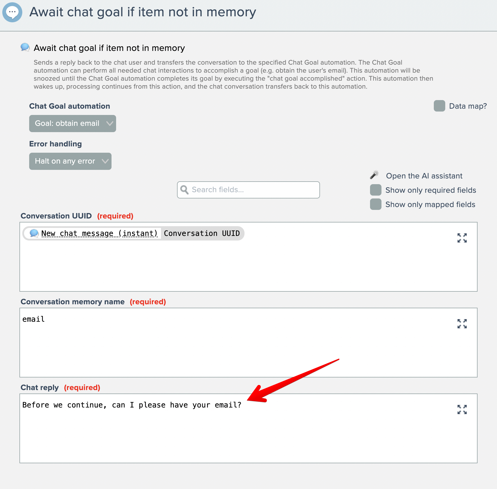 When control passes to the goal automation, a chat message is sent back to the chat widget user. The chat reply should inform the user what they need to do to satisfy the goal, generally by providing a piece of information.