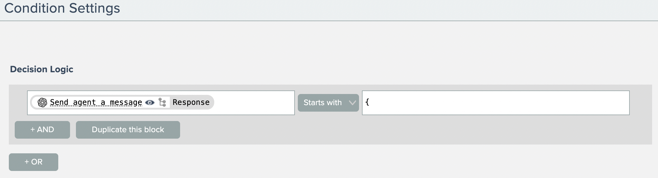The condition just checks to see if the AI model's response starts with a "{" which indicates the AI model has emitted the JSON containing the email: