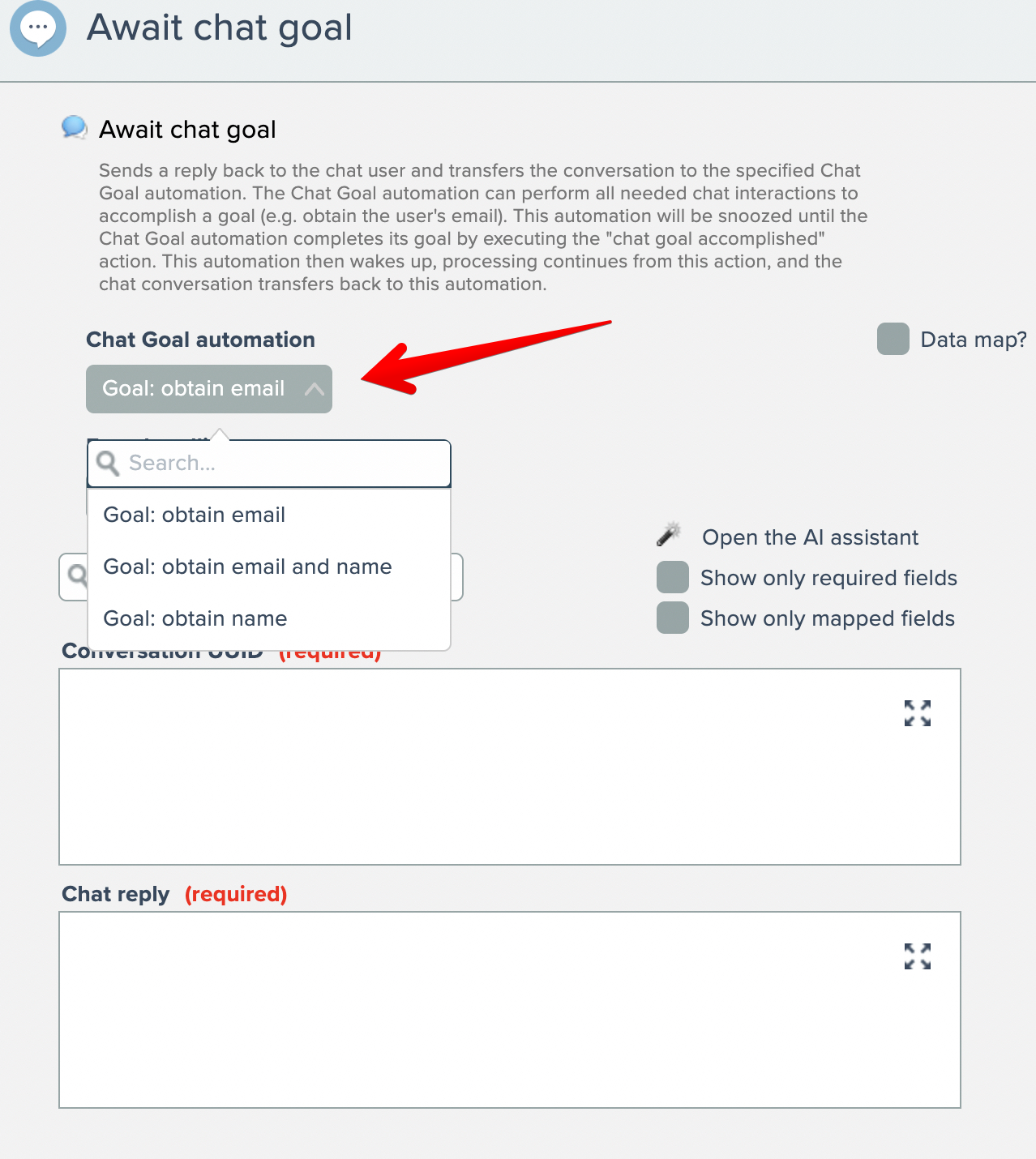 Unlike chatbot tool automations, goal automations are not invoked by the AI model. Instead, they are a mechanism for building chatbot logic in an easy-to-understand manner.