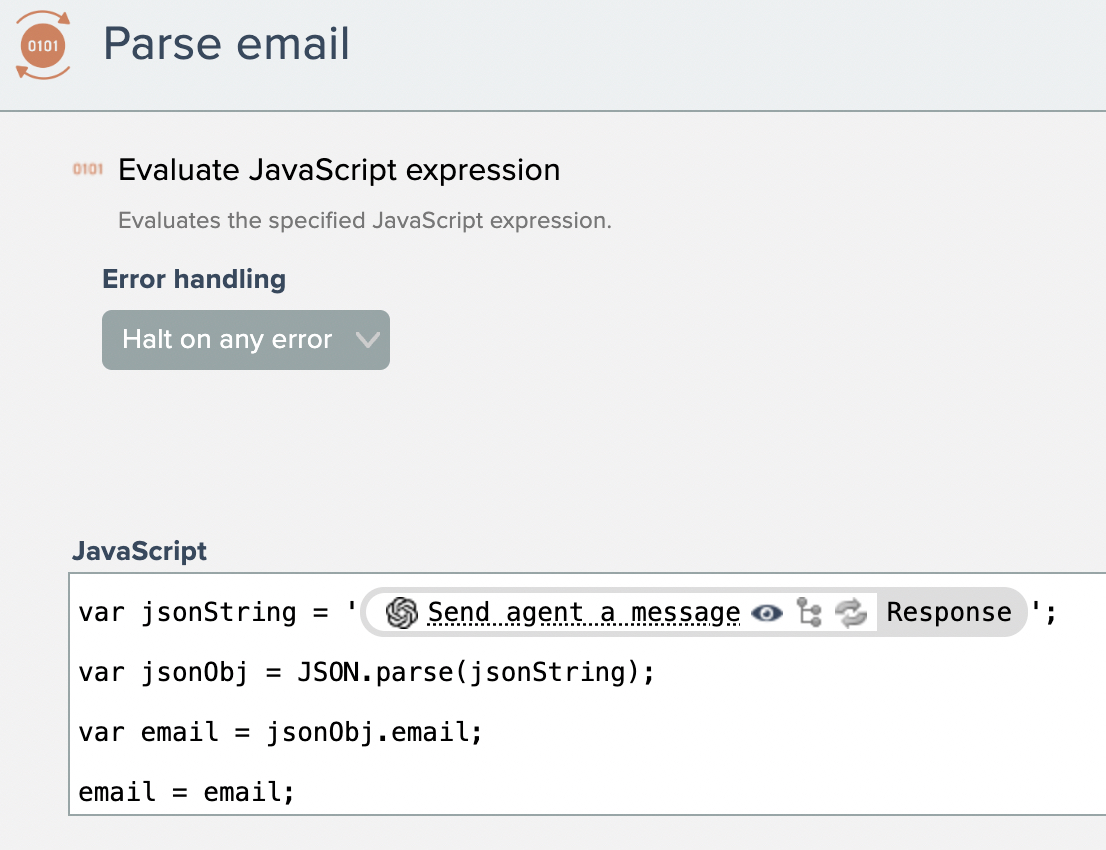 If JSON is not emitted, the goal automation sends back the AI model's response to the chat widget. Otherwise the JSON is parsed via JavaScript: