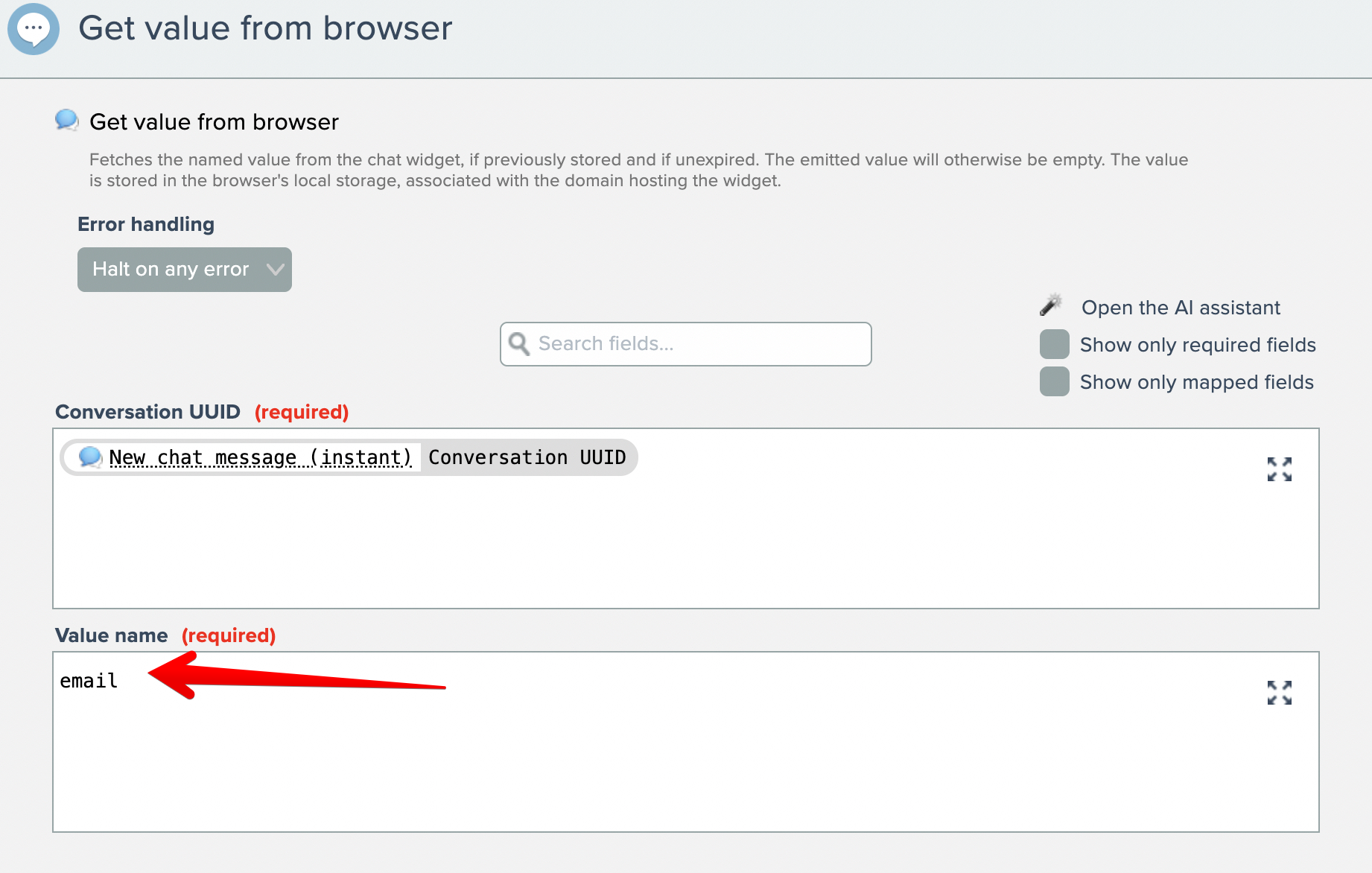 Then to fetch the value from the chat automation, use the Automation Chat Widget's "get value from browser" action: