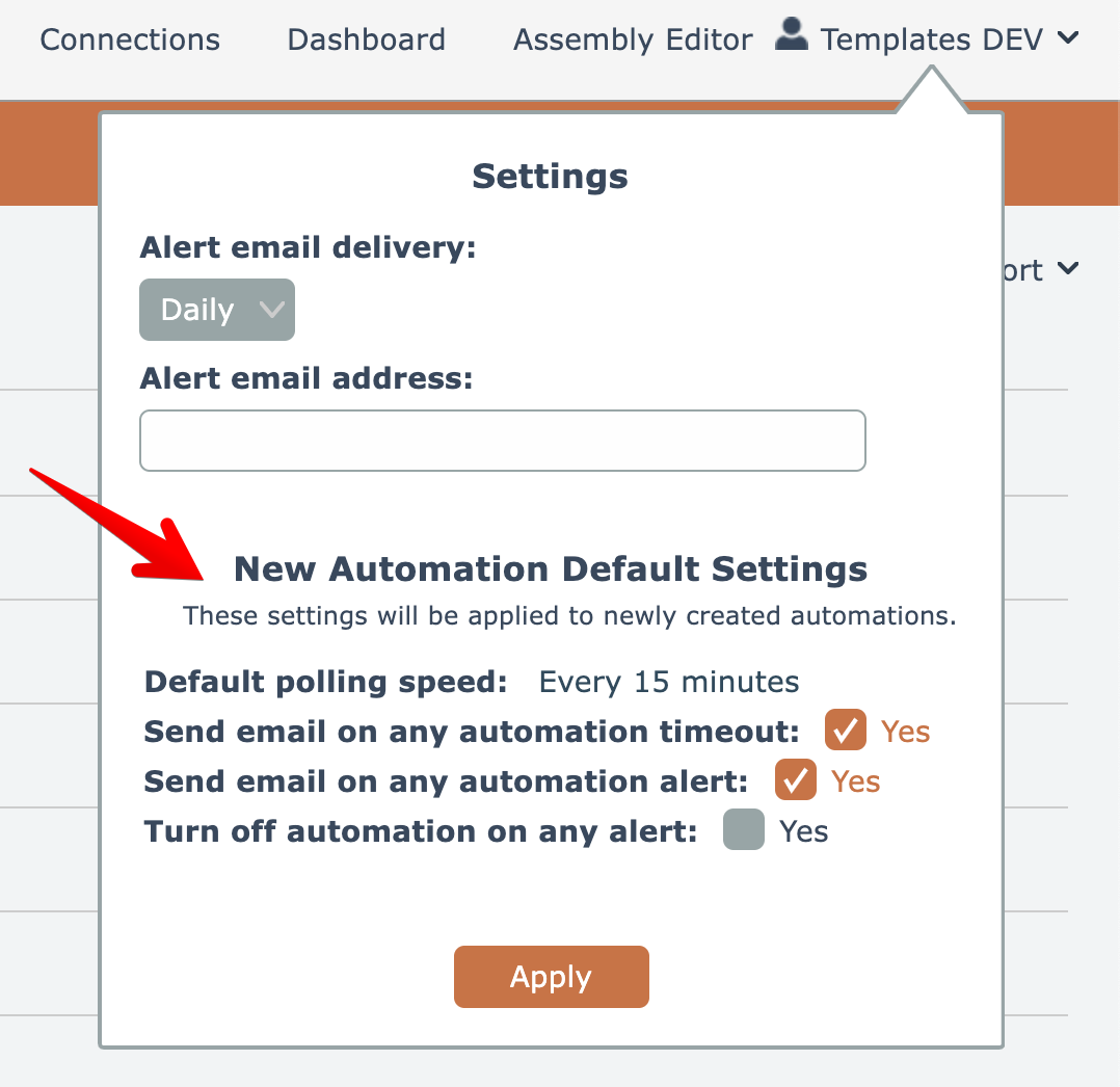 Certain defaults can be configured to use when building new automations. The defaults are found via the Settings options under your account menu at the top right: