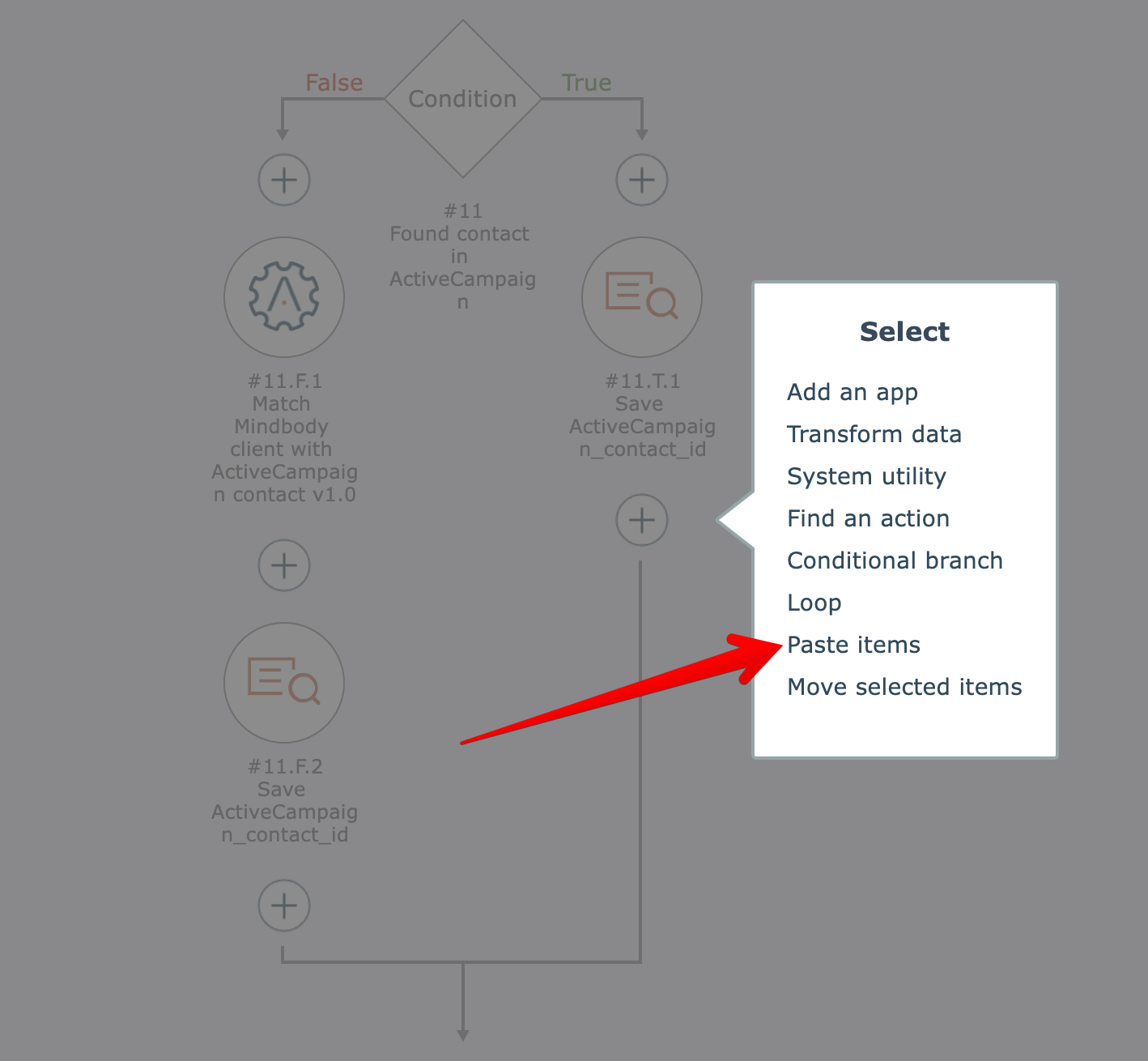 Finally, click the plus icon where you want to copy the items and choose the Paste option: