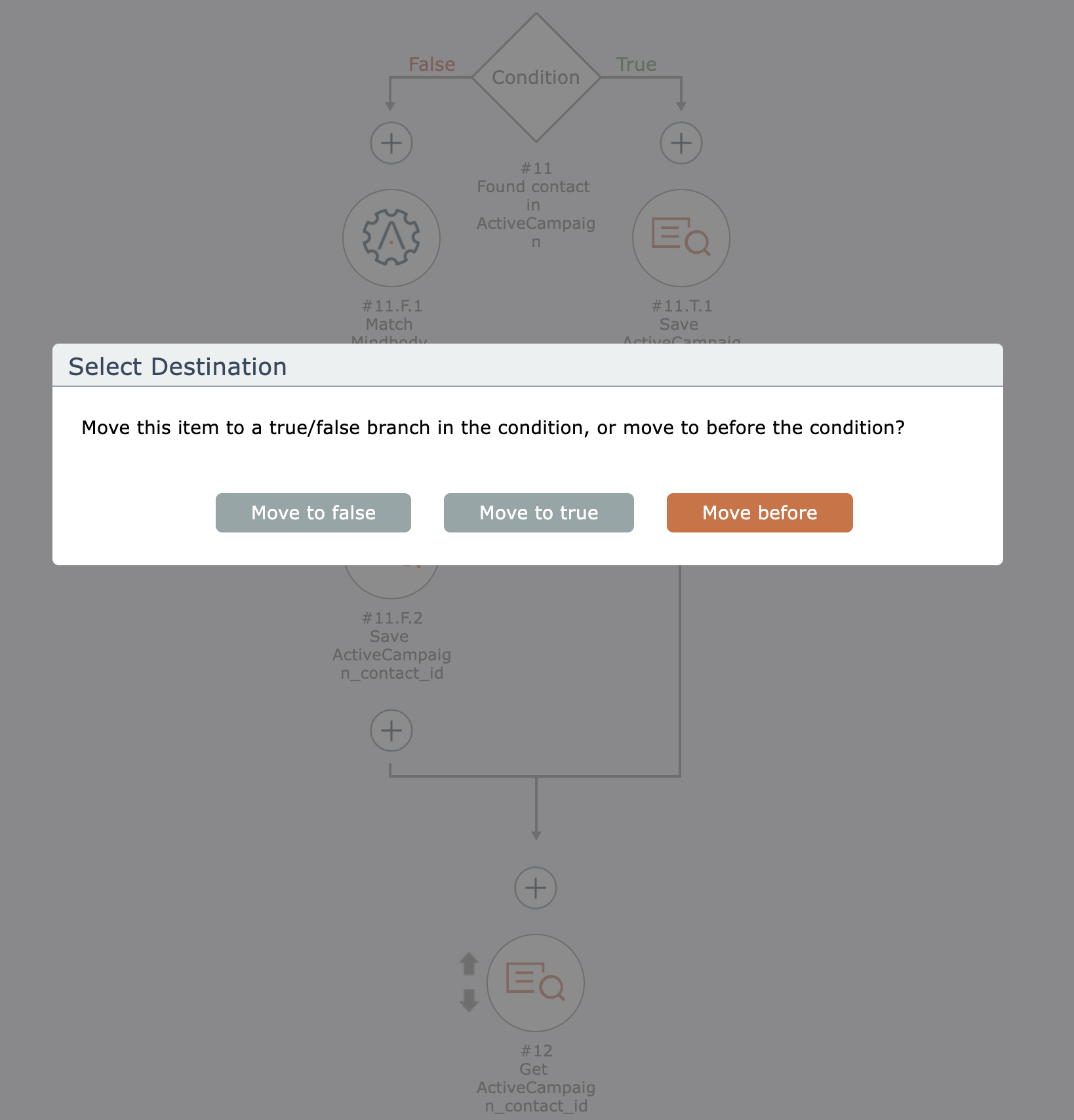 If an action item movement could result in it being inserted into either a condition or a loop, the editor will ask to confirm where you want the item moved: