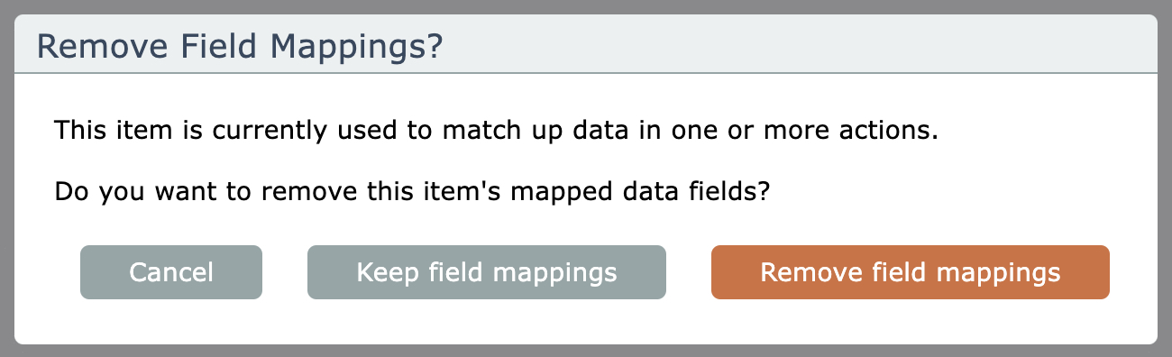 If the item is referenced in any field mappings the editor will prompt whether to remove those field mappings, or to retain them: