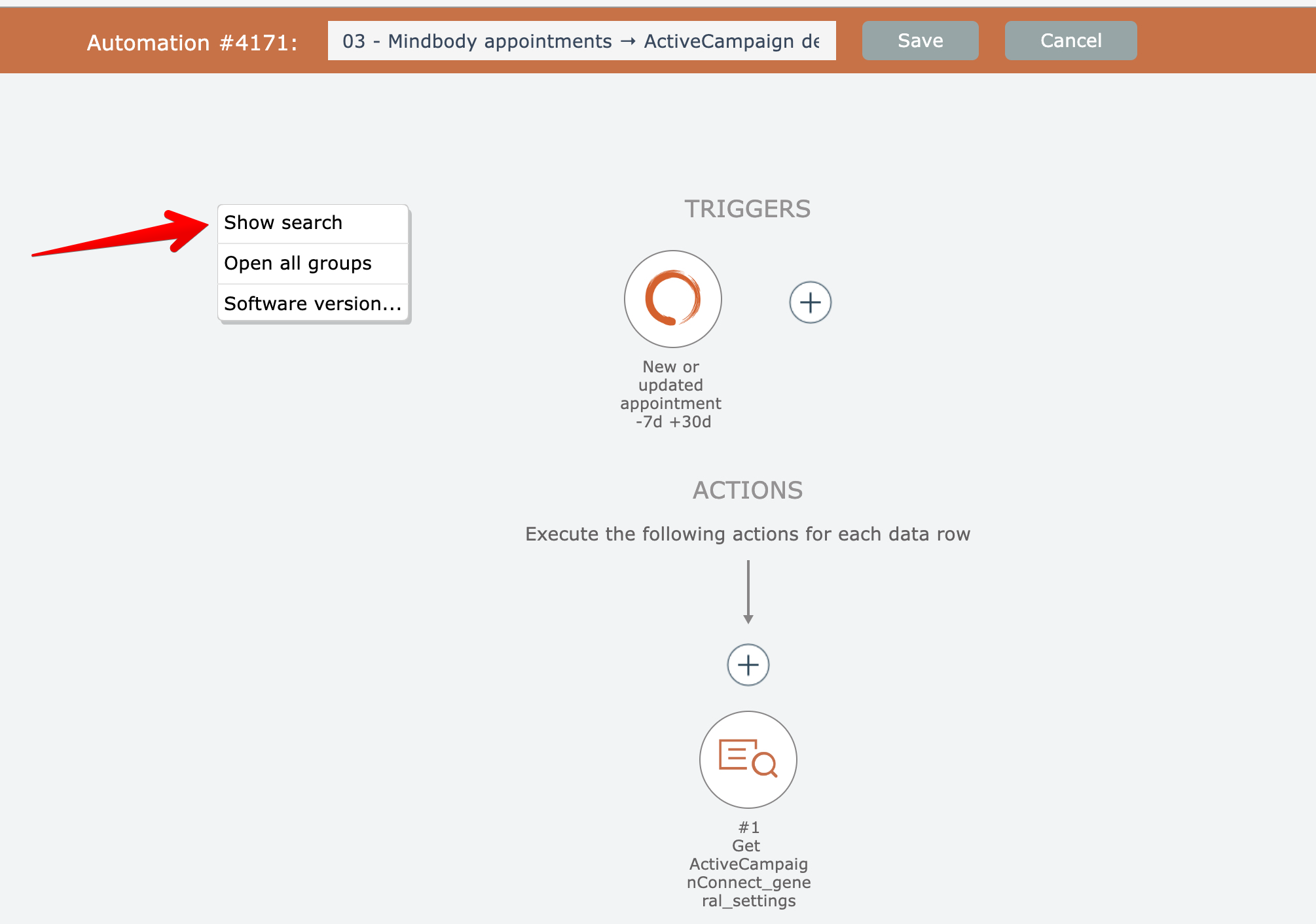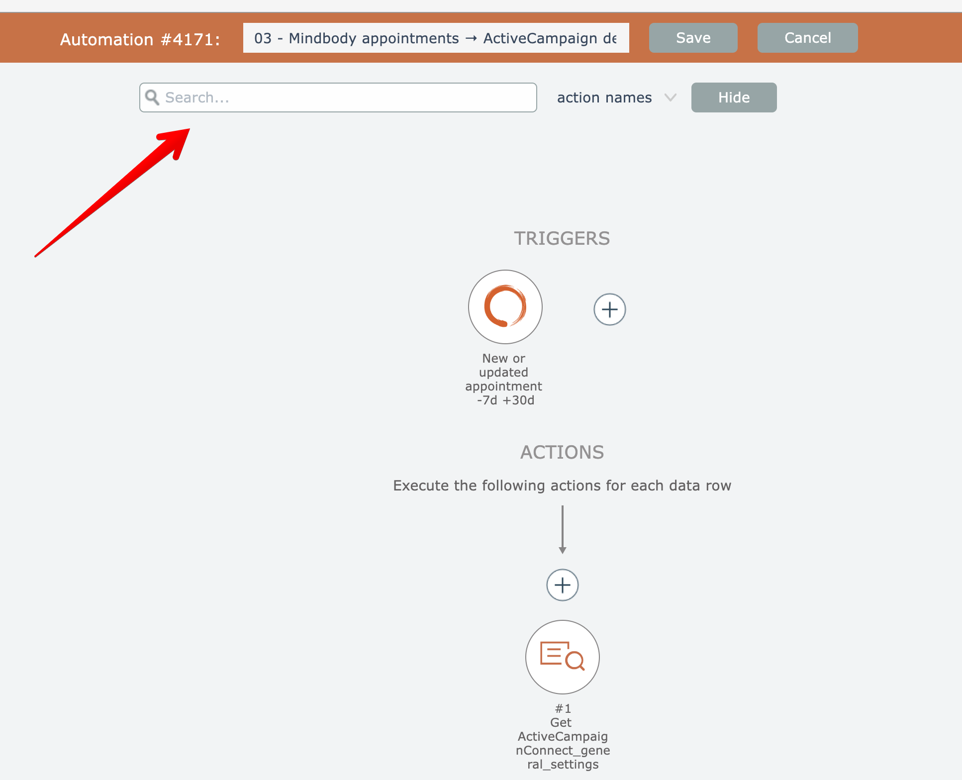 The automation editor lets you search to find matching content within your automations.