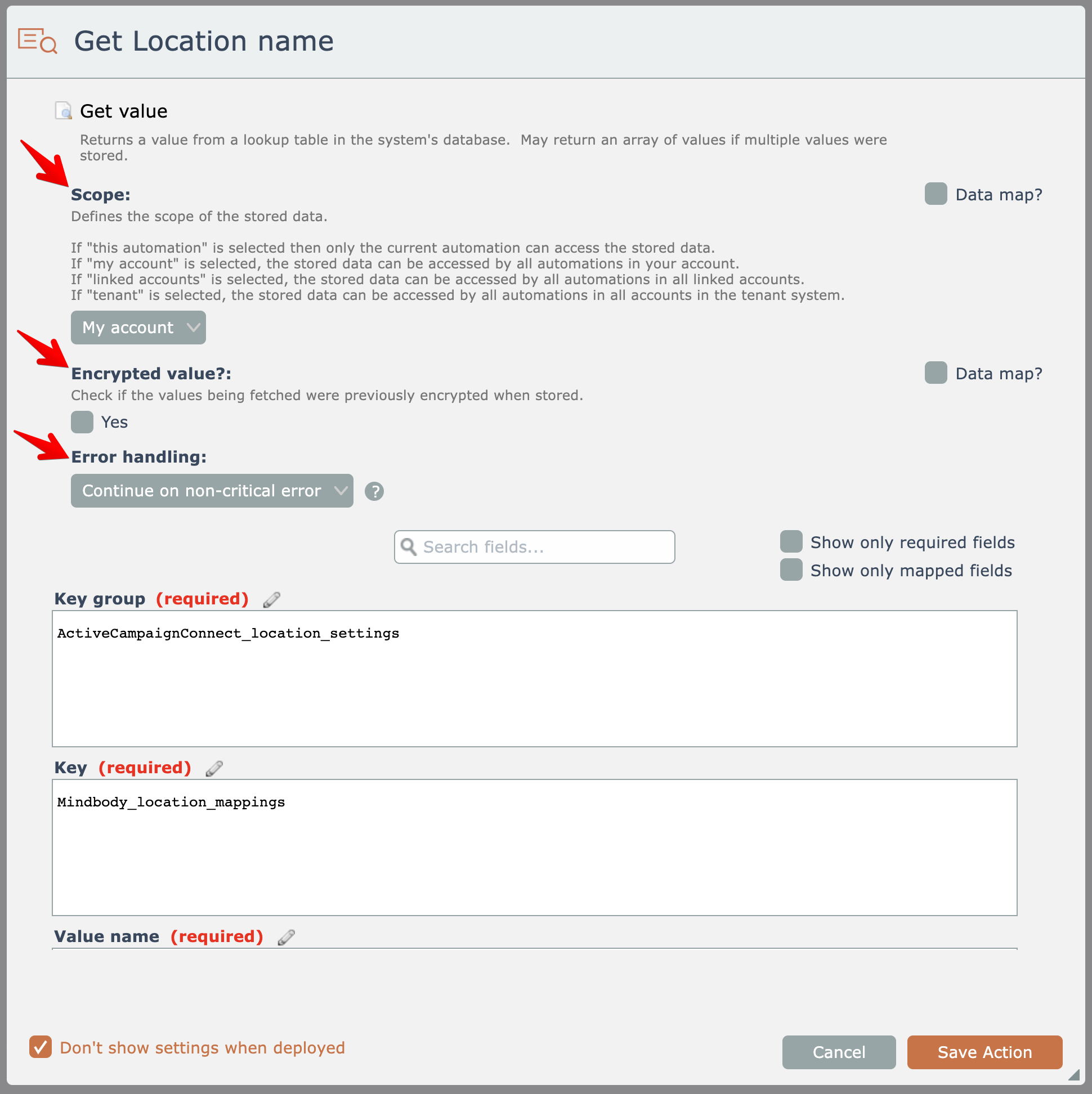 This action has three settings named "scope", "encrypted value?", and "error handling".