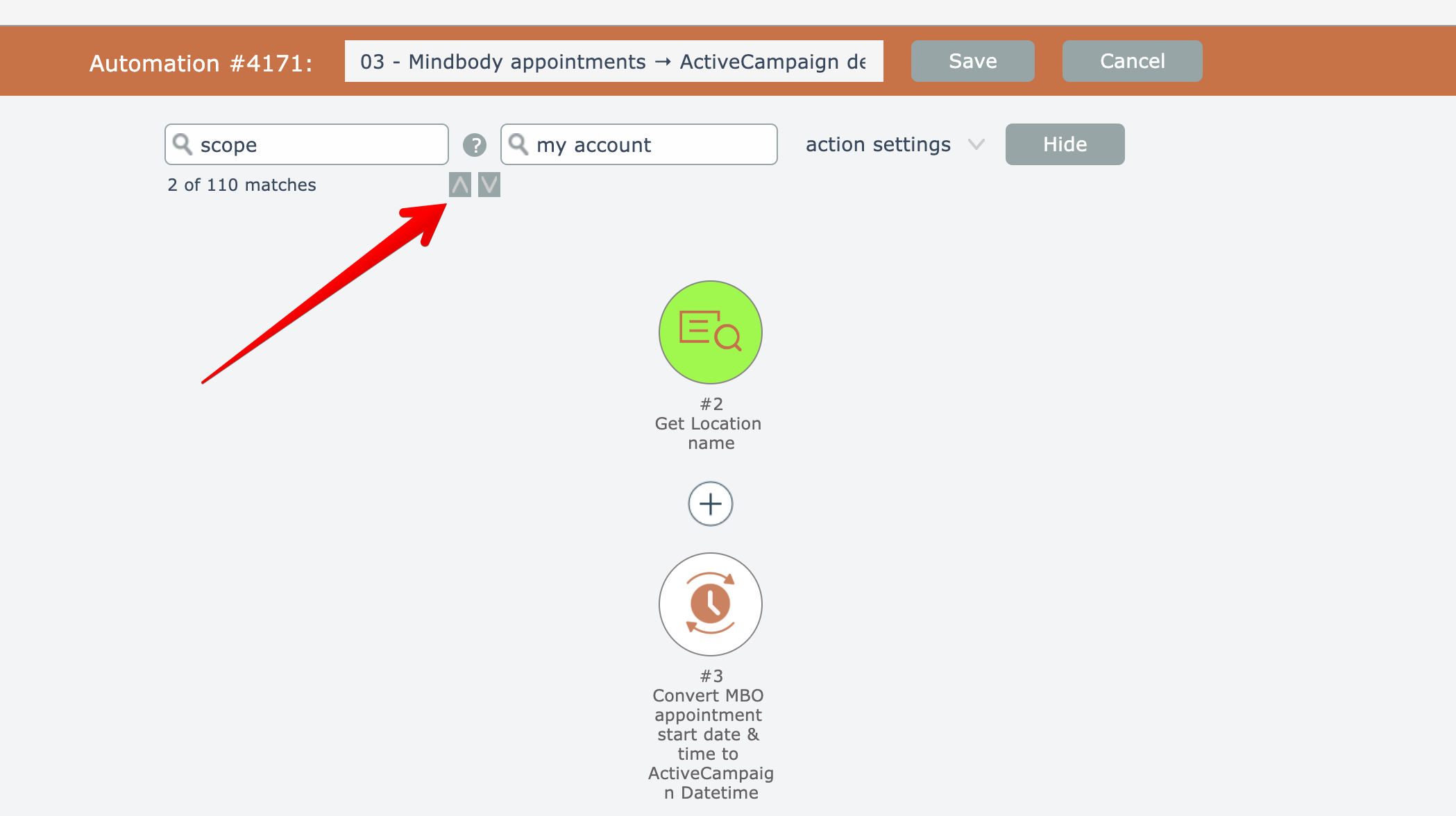 For example, in the action above has a "scope" setting with a value of "My account". Let's search to find that.