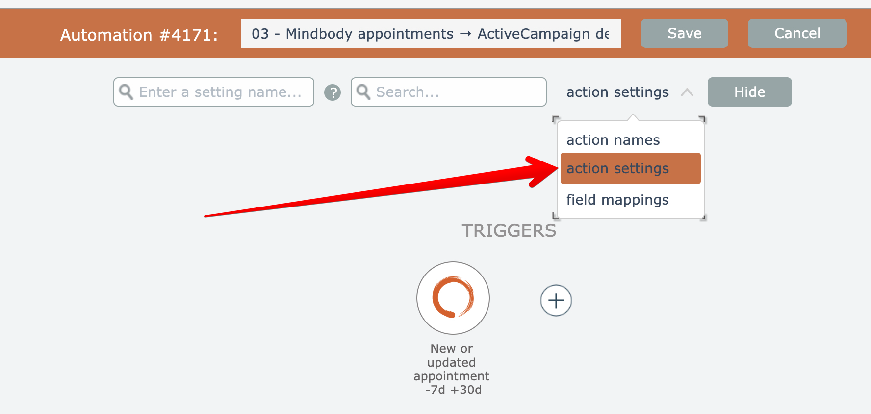 First, open the search (see Searching) and select "action settings" as the search criteria: