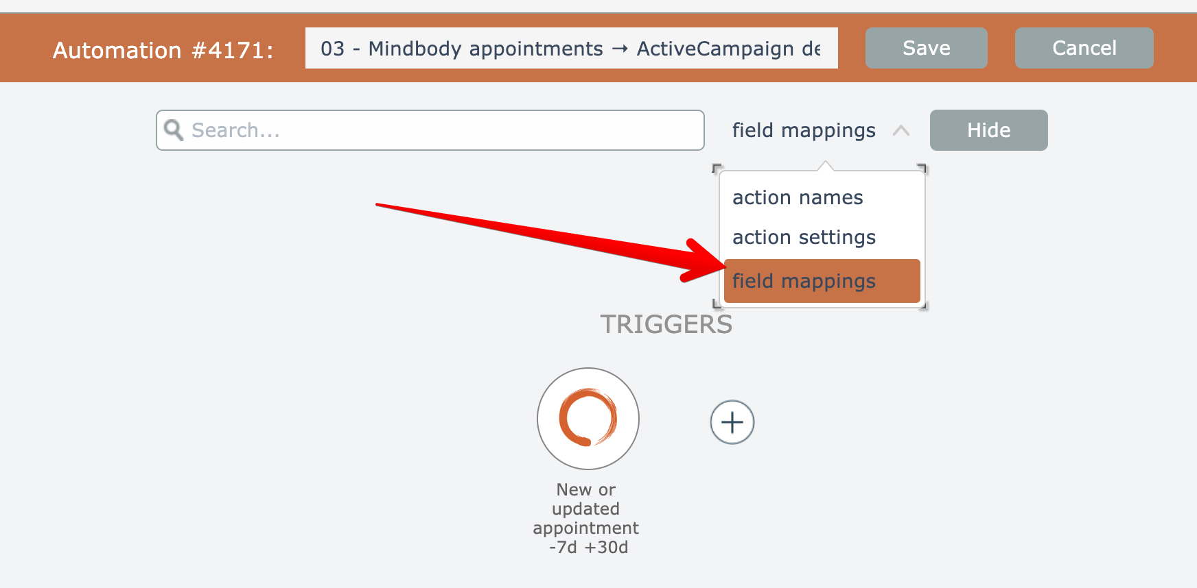 Learn how to search for actions with specific values in their input fields with this comprehensive document. Follow step by step instructions on utilizing the search function, selecting "field mappings" as the search criteria, and entering your desired va