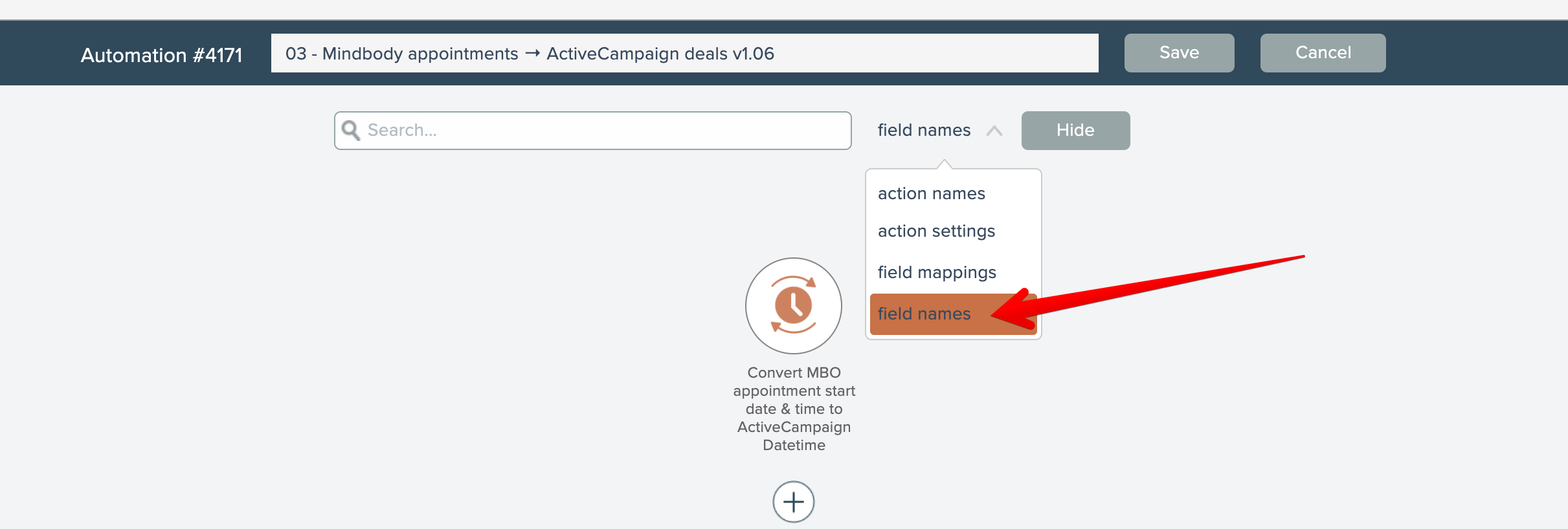 You can search an automation to find all actions having at least one field name that matches a search query.