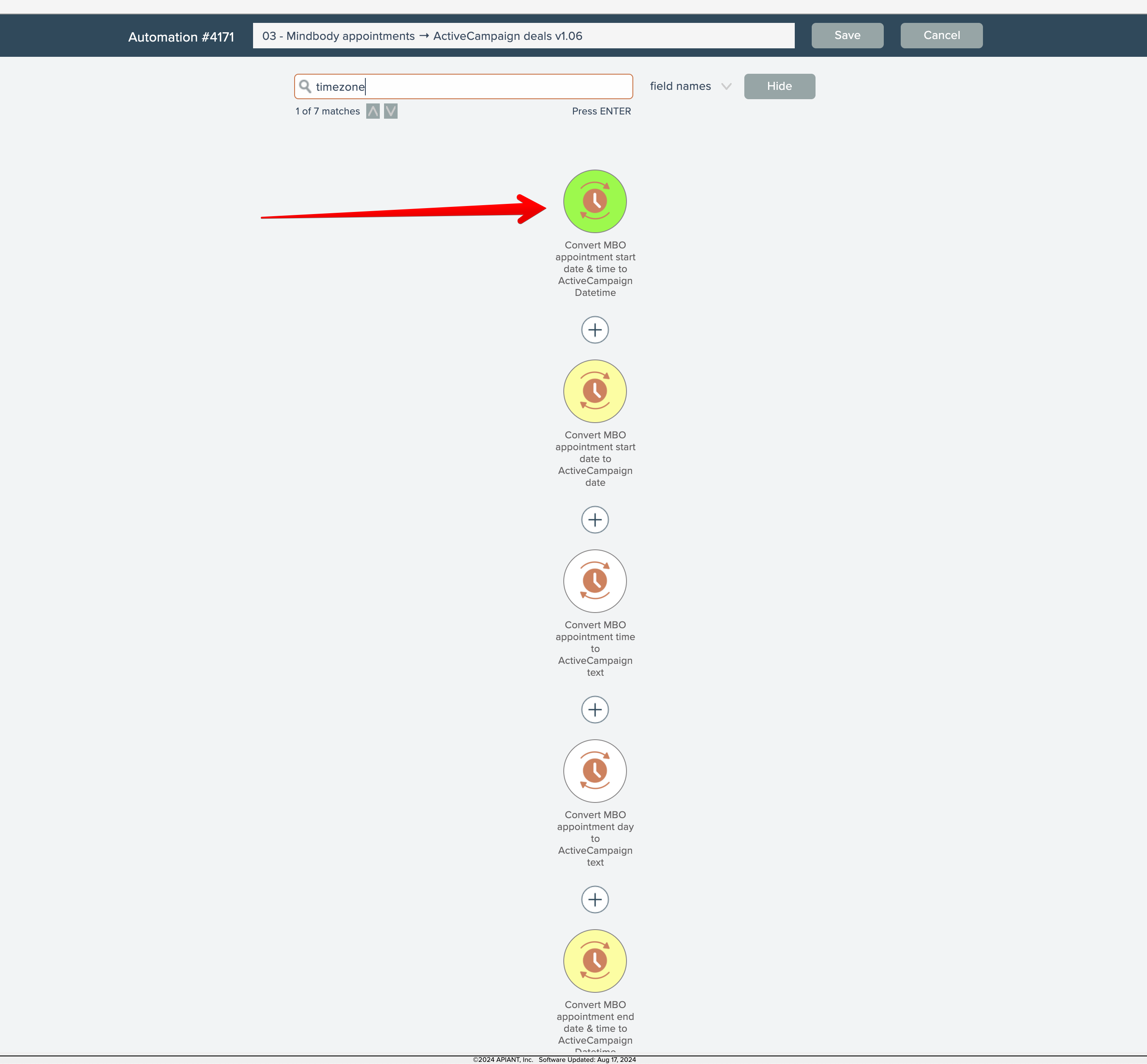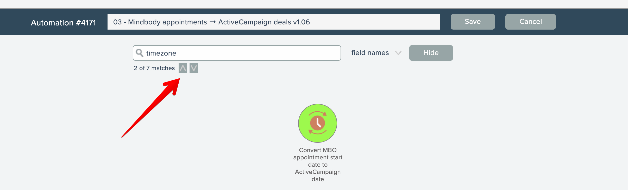 For example, in the action above has a field named "Timezone offset seconds". Let's search to find that.