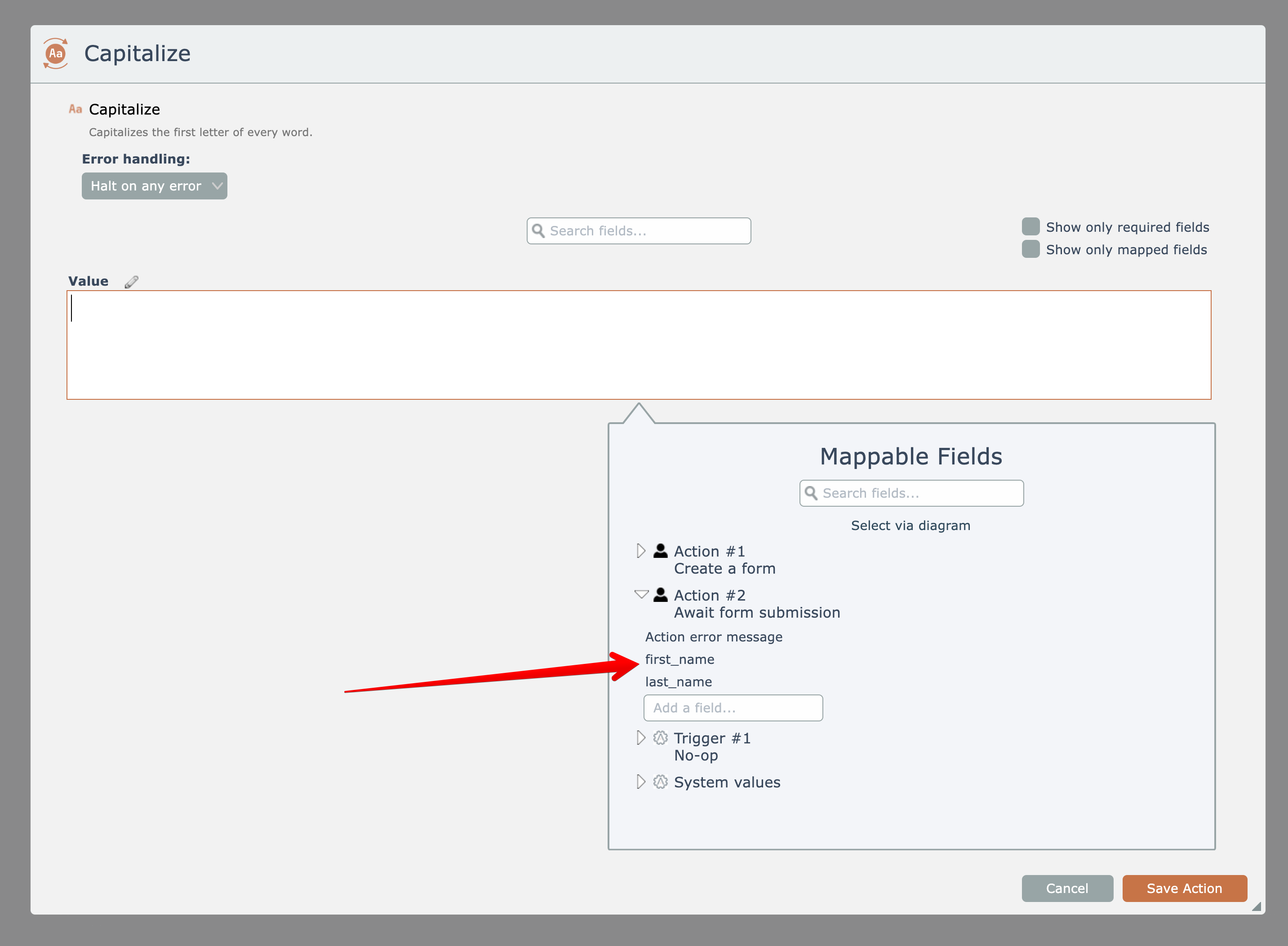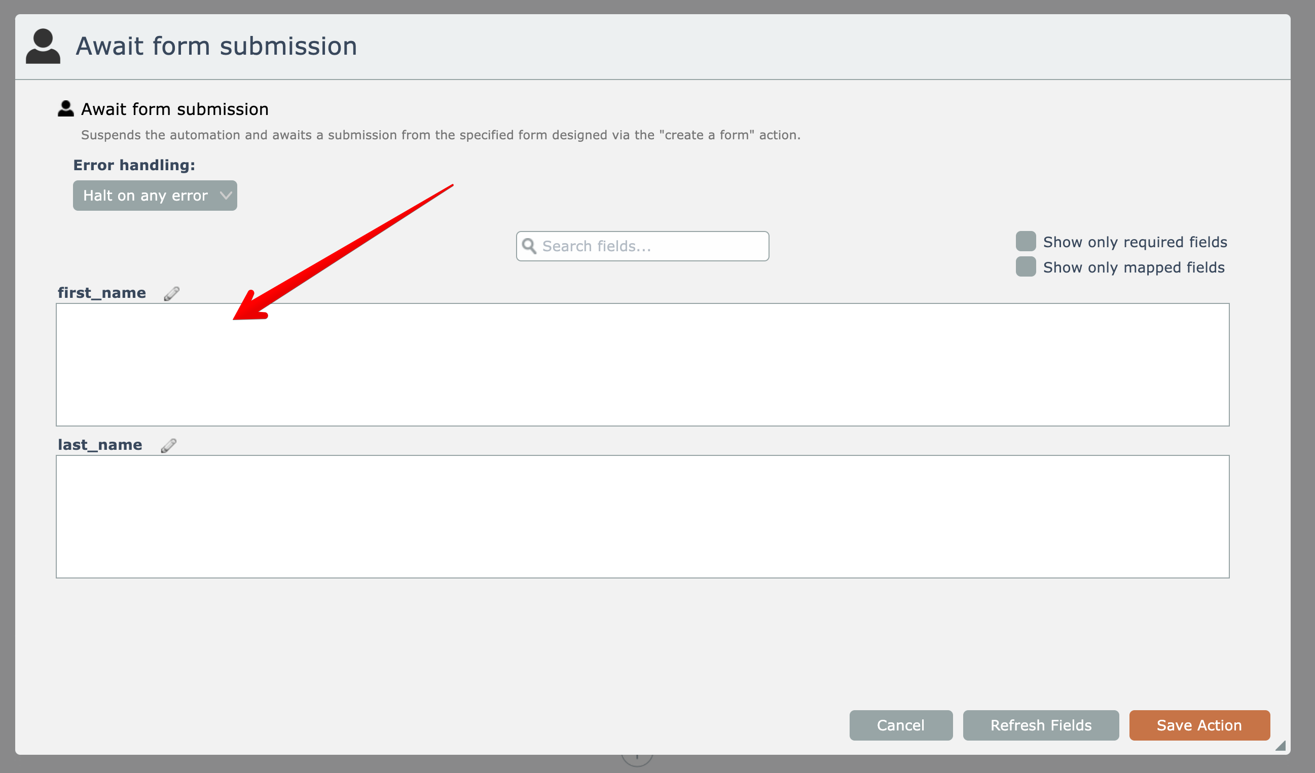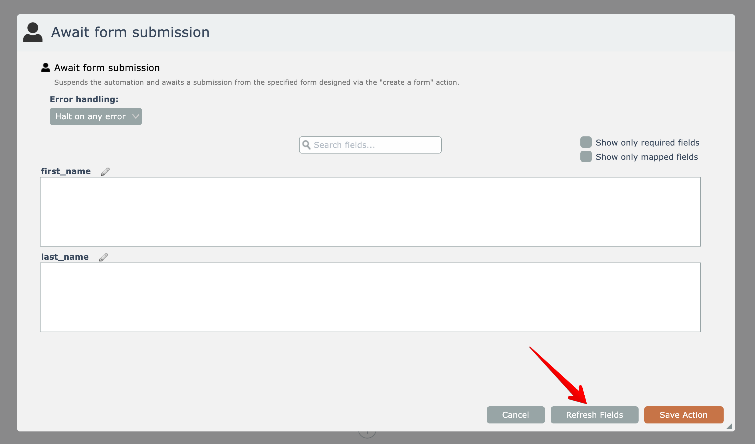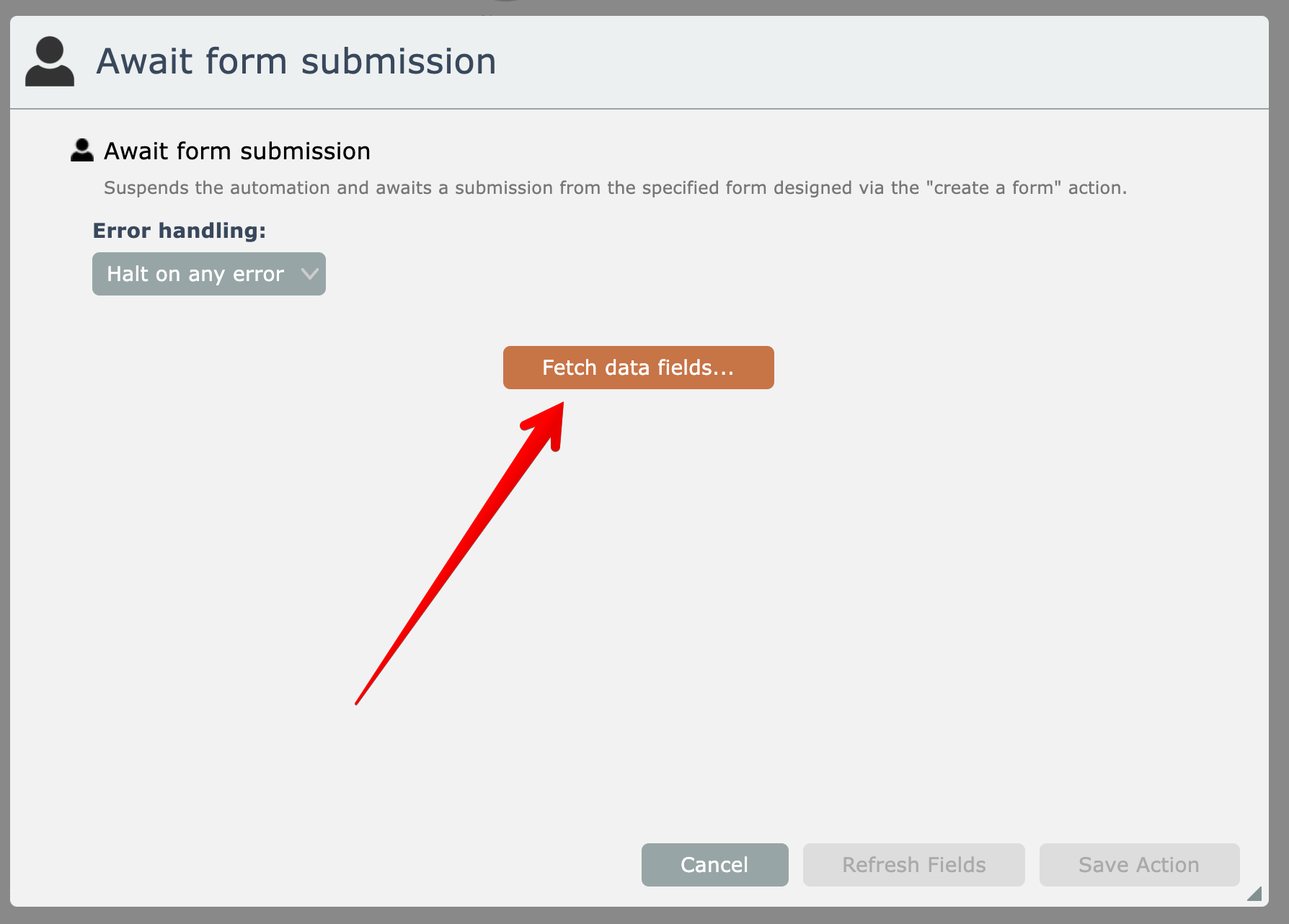 After adding the "await form submission" action, the form's fields must first be fetched: