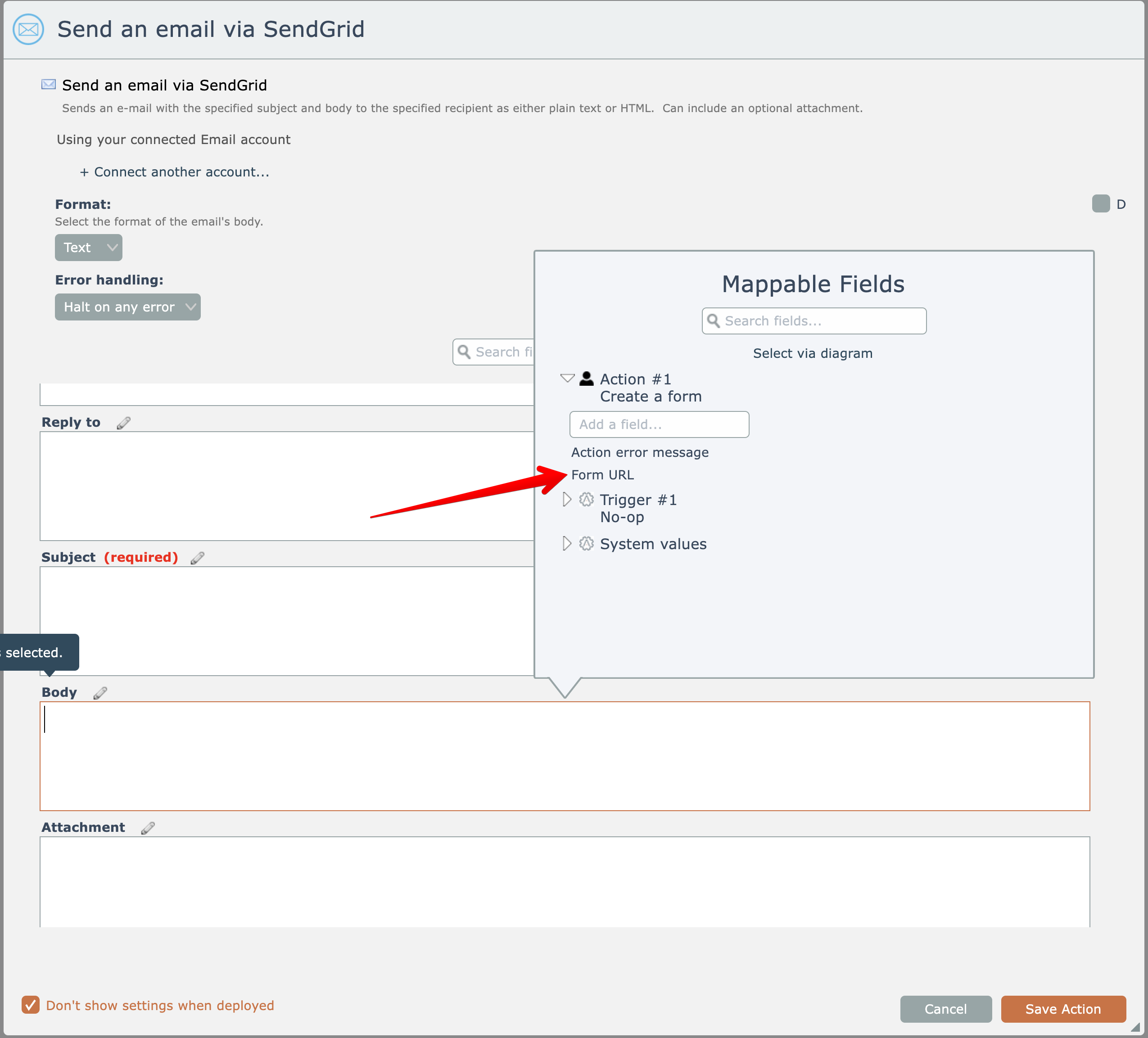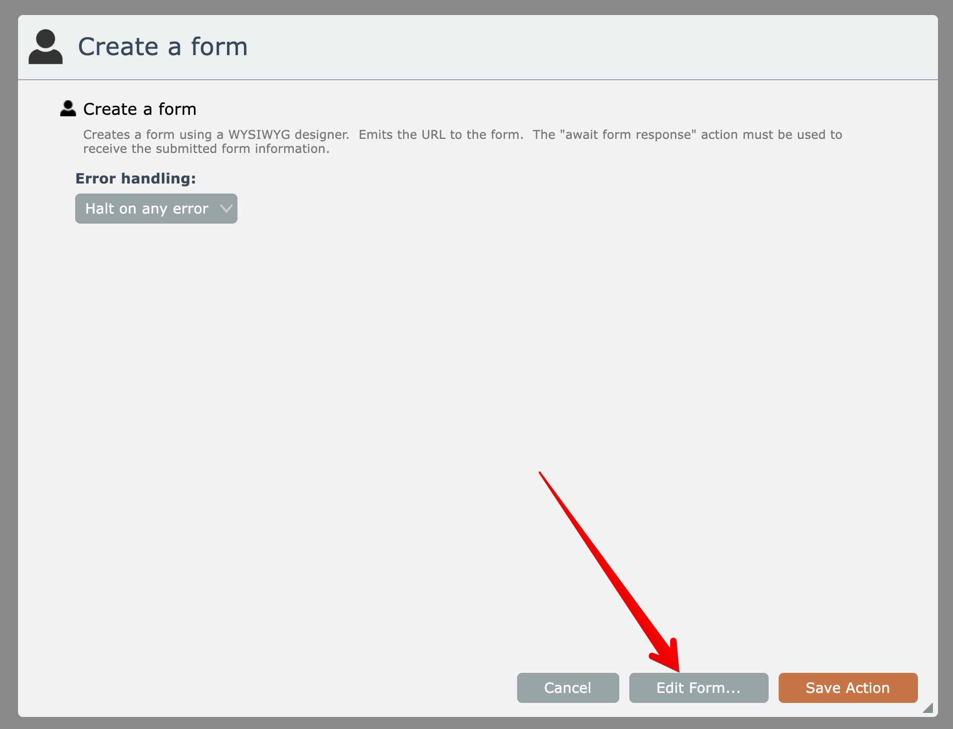 The "create a form" action emits the URL to the form, which is typically sent to someone via another action like email: