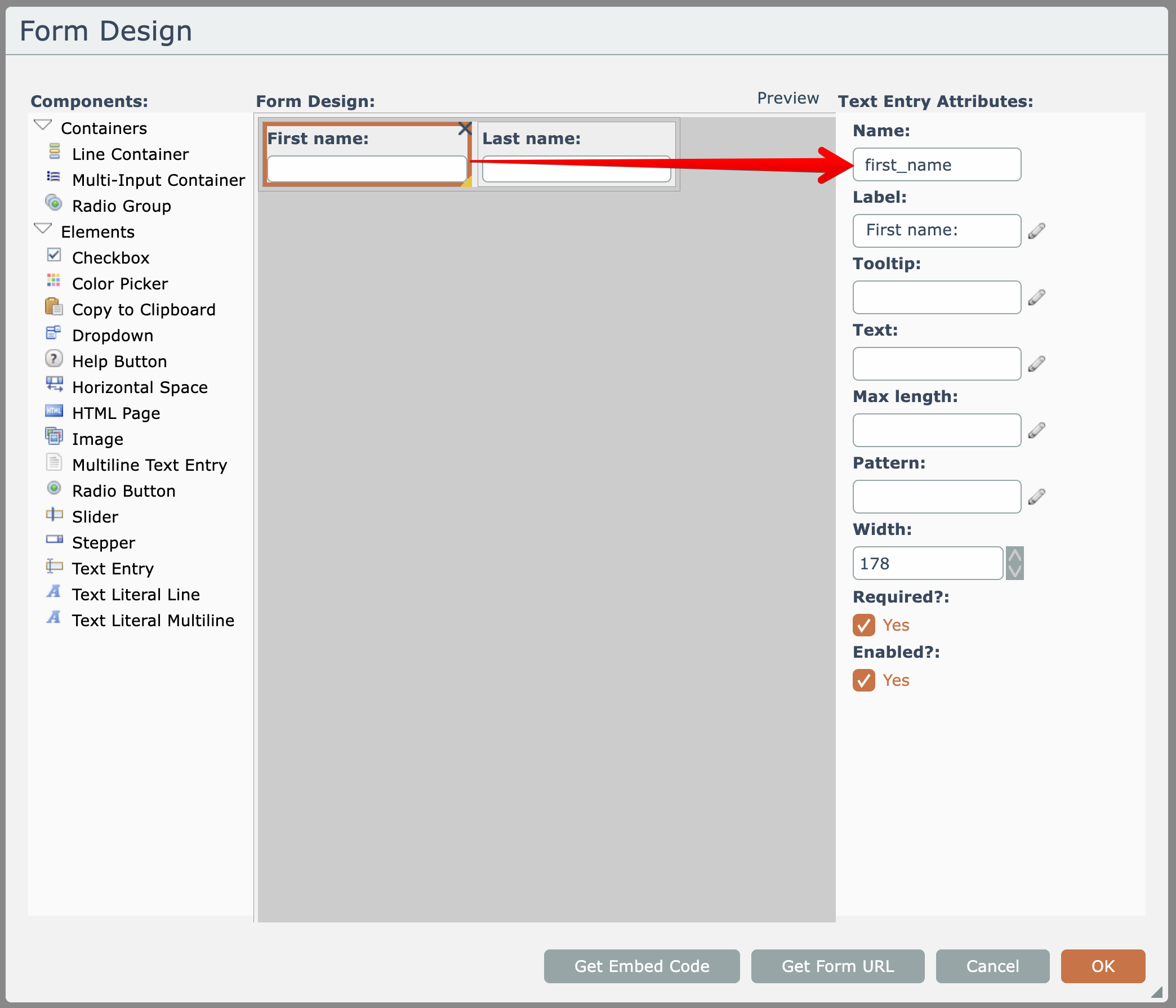 The input field names come from the UI elements within the form. For example, in the previous example the "first_name" field comes from this text entry field's name in the design: