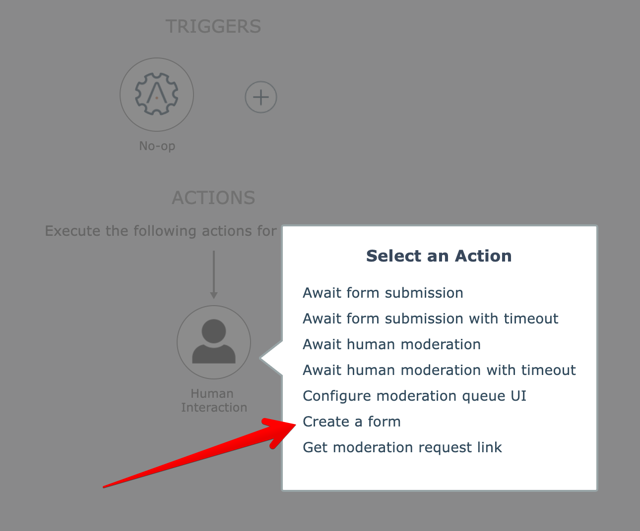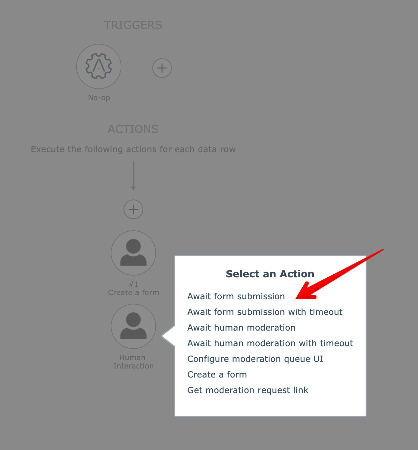 The Human Interaction app under System Utilities includes "await form submission" actions that pause the automation until the form is submitted: