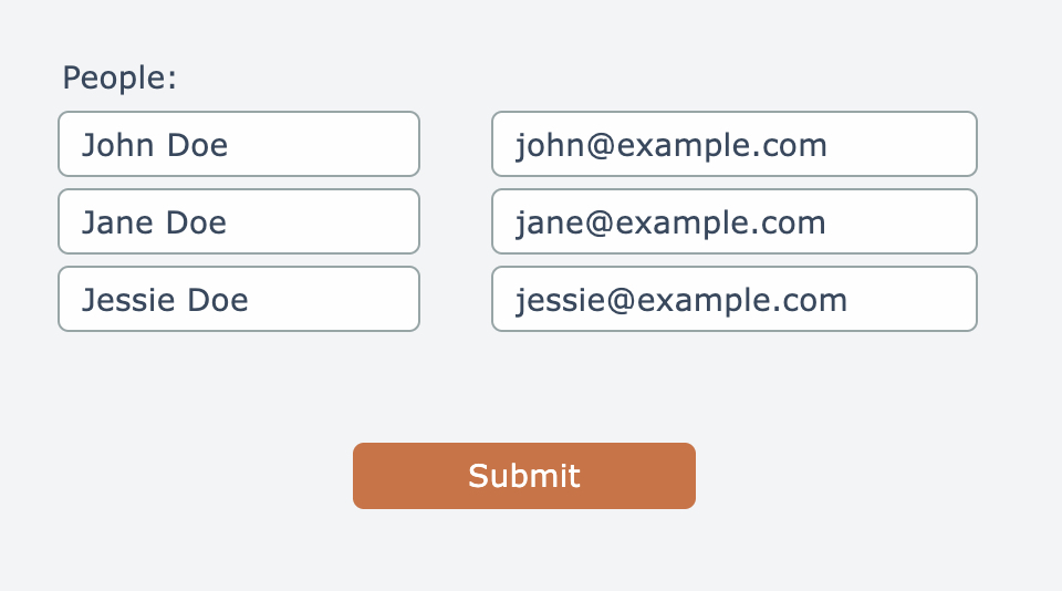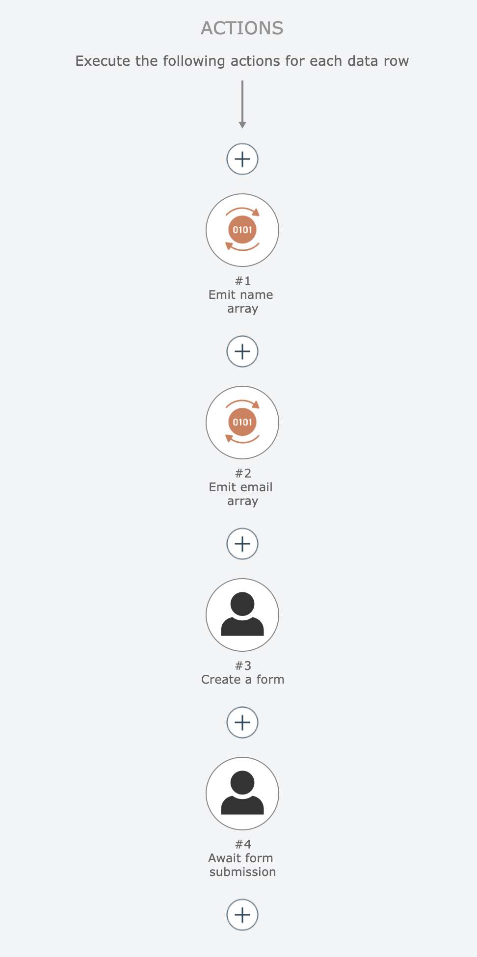 When the form is submitted, the "await form submission" action will emit the names and emails as array fields.