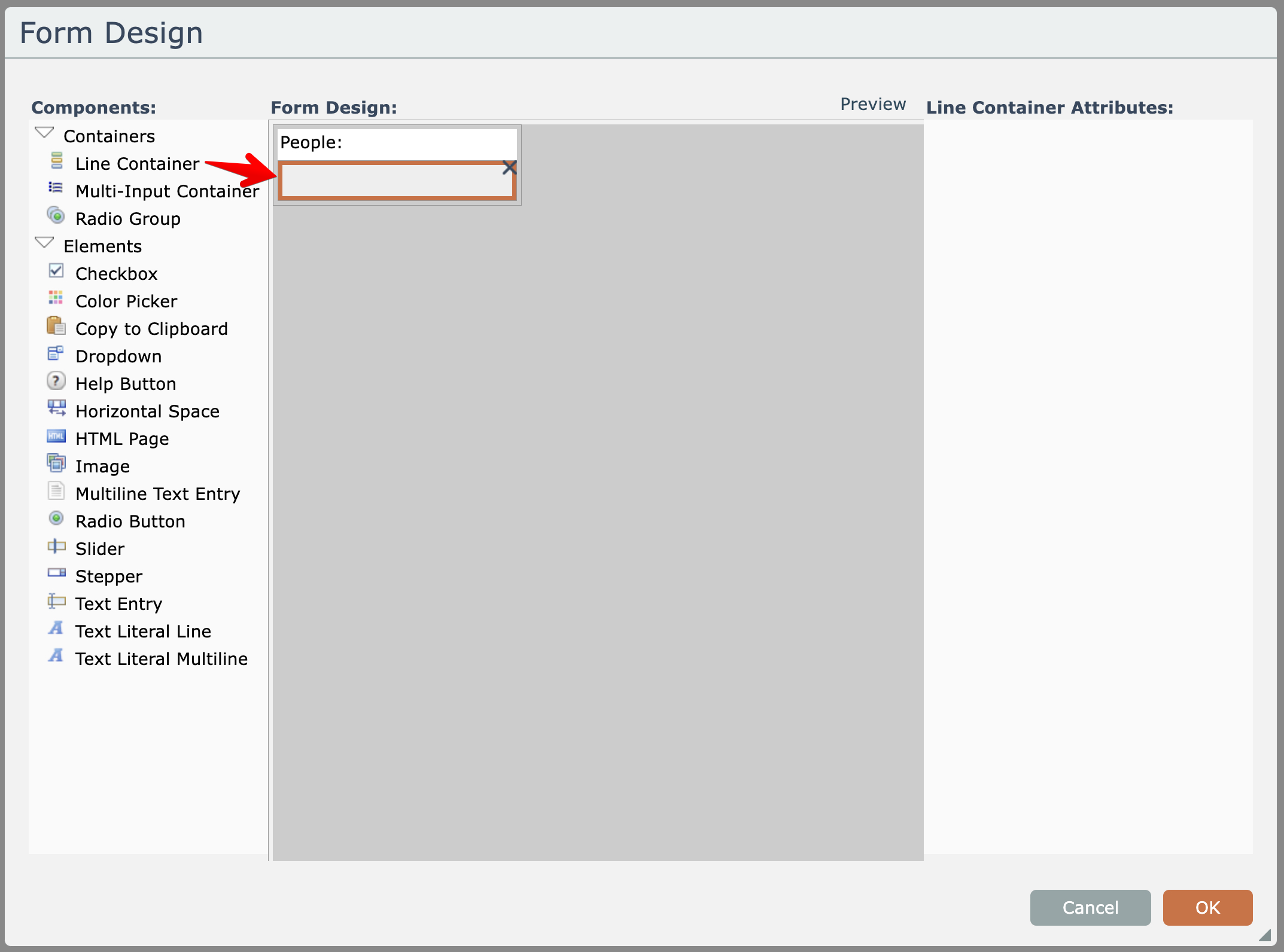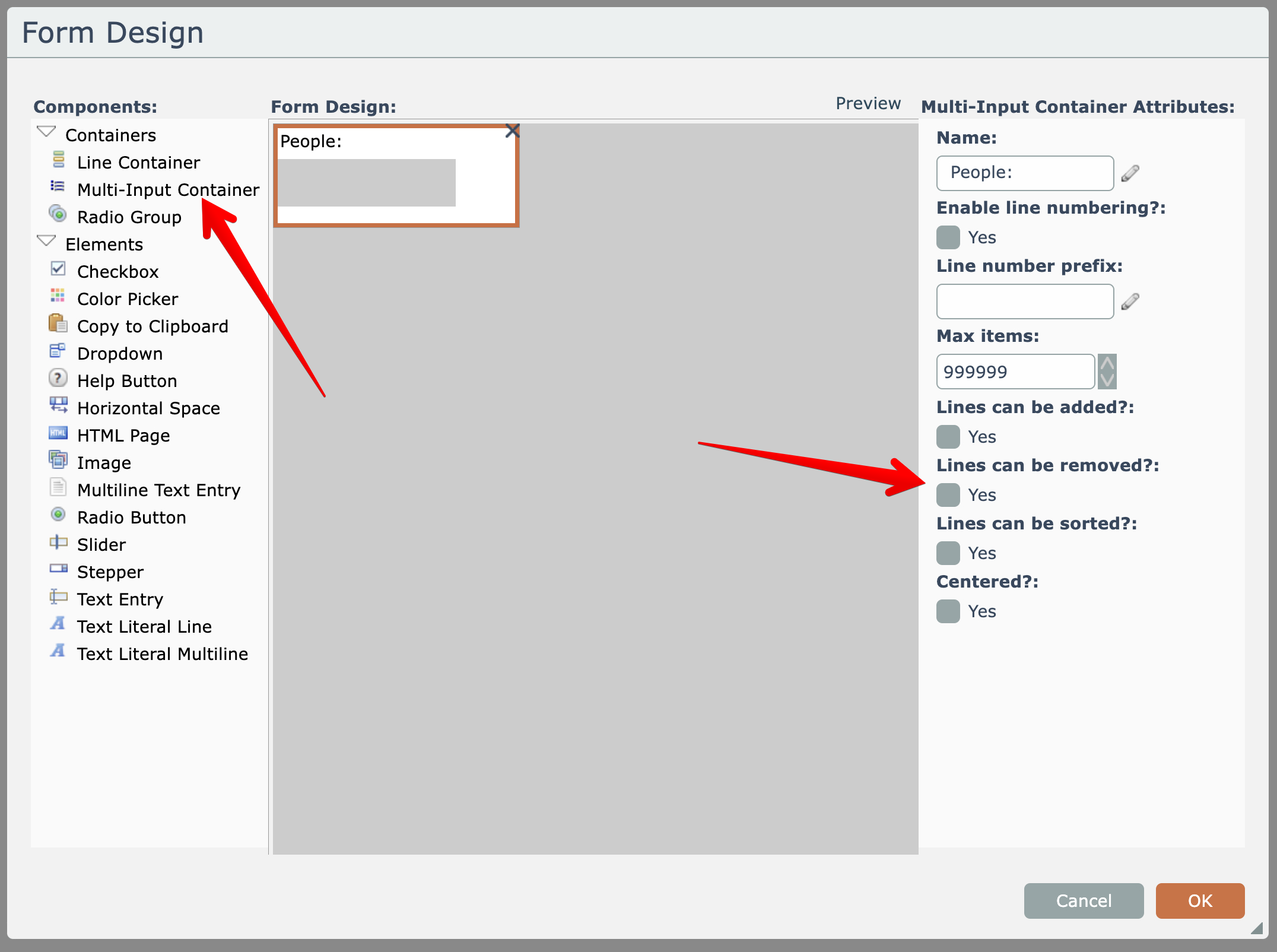 In the form design, we start by adding a multi-input container and configure it to not allow lines to be added, removed, or sorted: