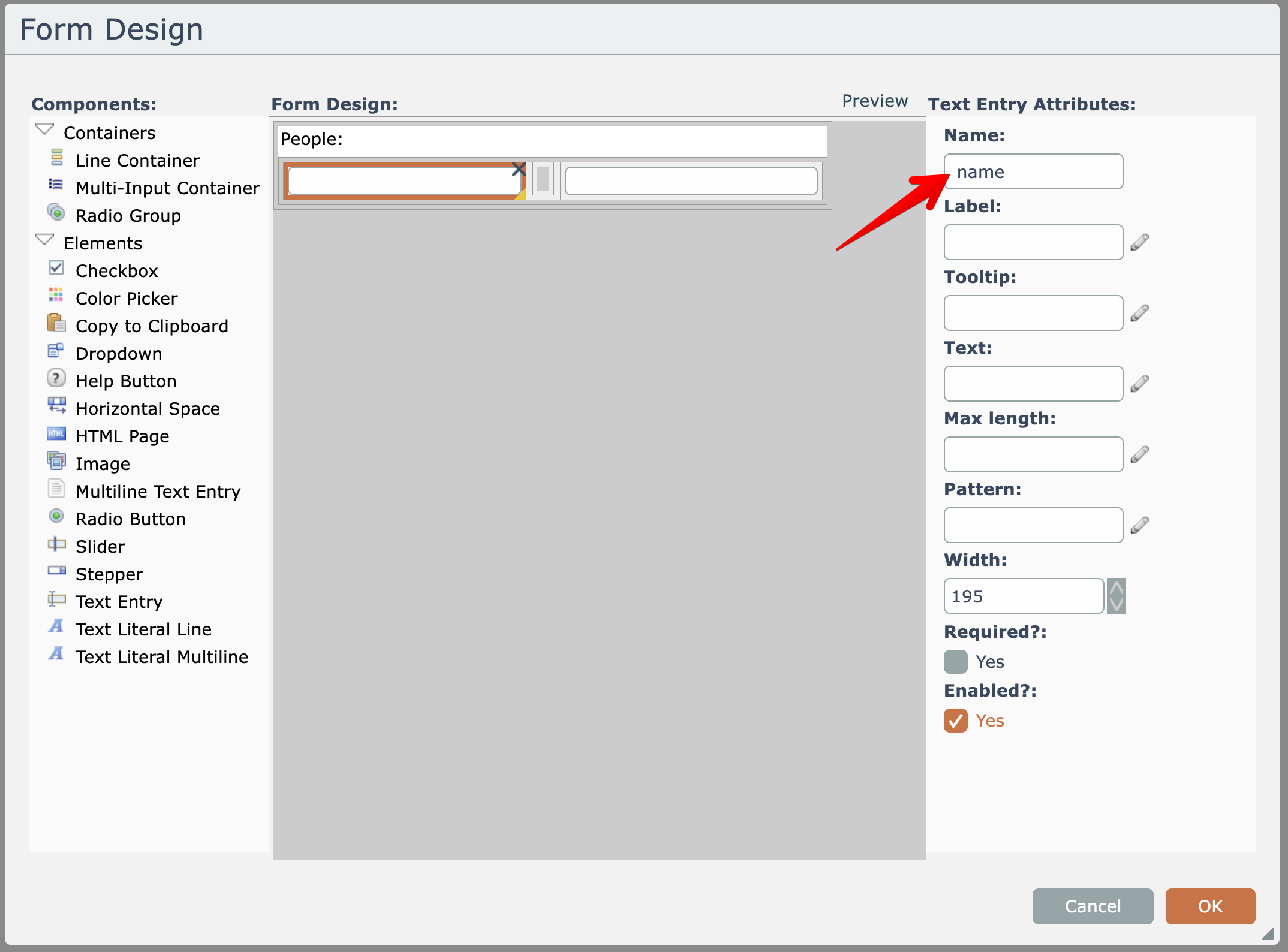 Then design how you want each line to appear. For this example, we will just have two text entry fields side-by-side with a horizontal space between them. The first text entry is named "name" for the person's name and the second is named "email":