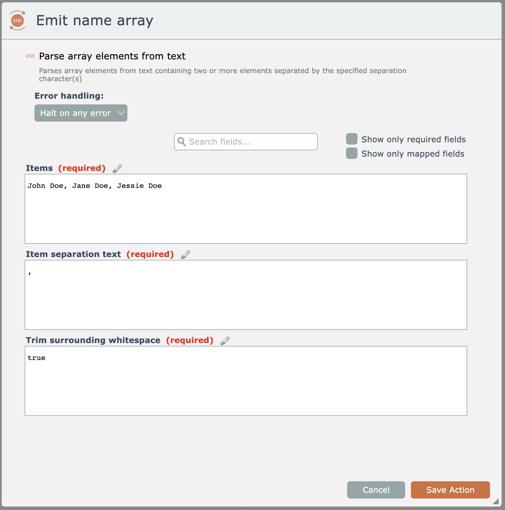 For this example, we will use the Transform Data "parse array elements from text" action to emit some sample array data consisting of names and email addresses: