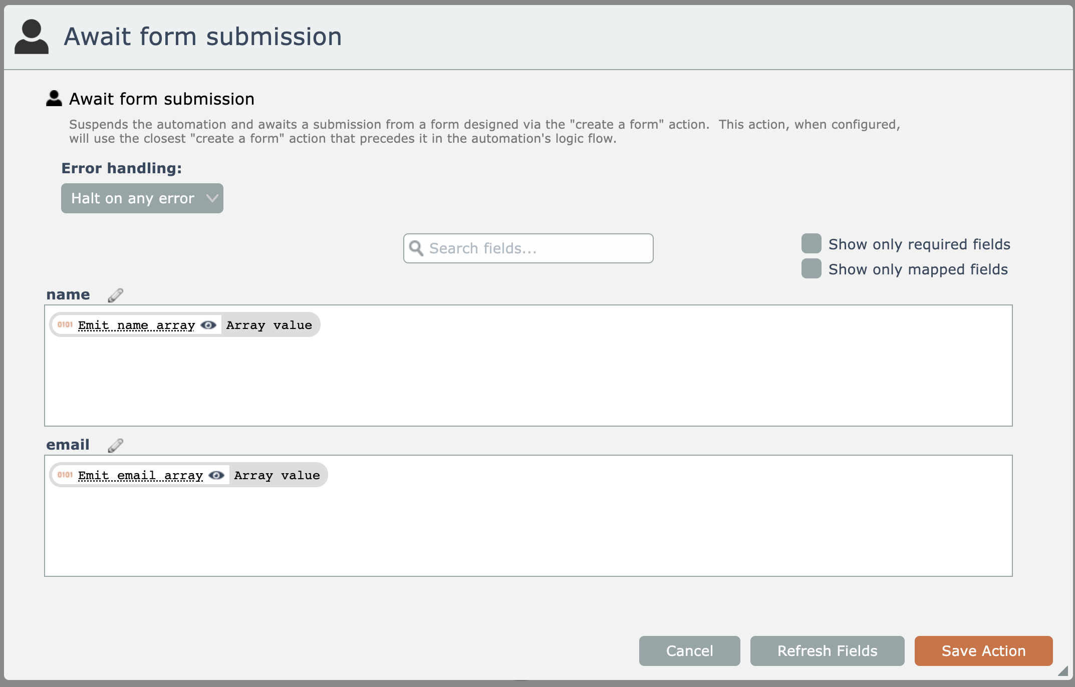 Then for the "await form submission" action, we map the arrays to the text fields: