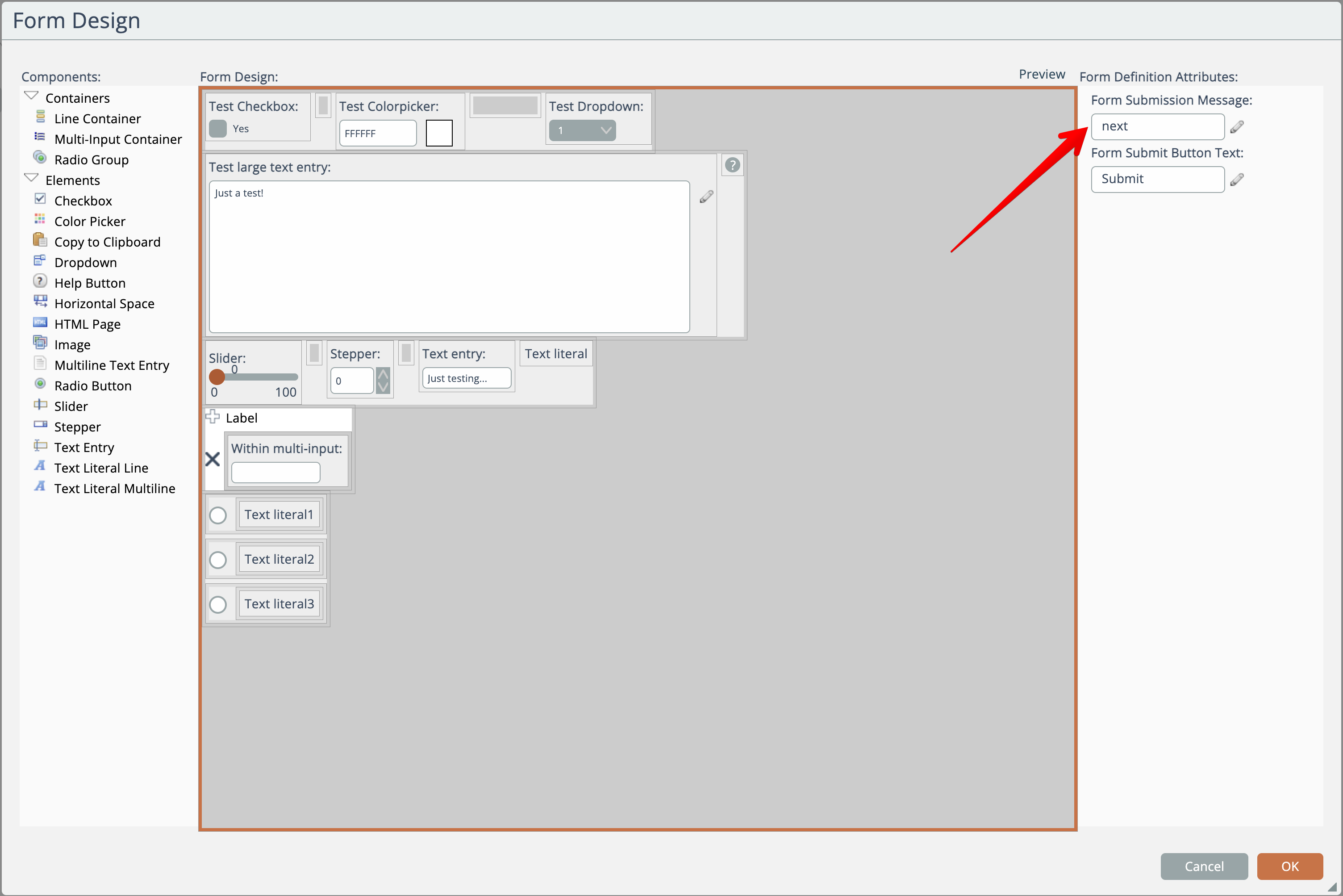 To indicate that the automation will display another form after the current form is submitted, enter 'next' as the form submission message here by clicking on the background of the form designer (the outer edge of the designer will be highlighted):