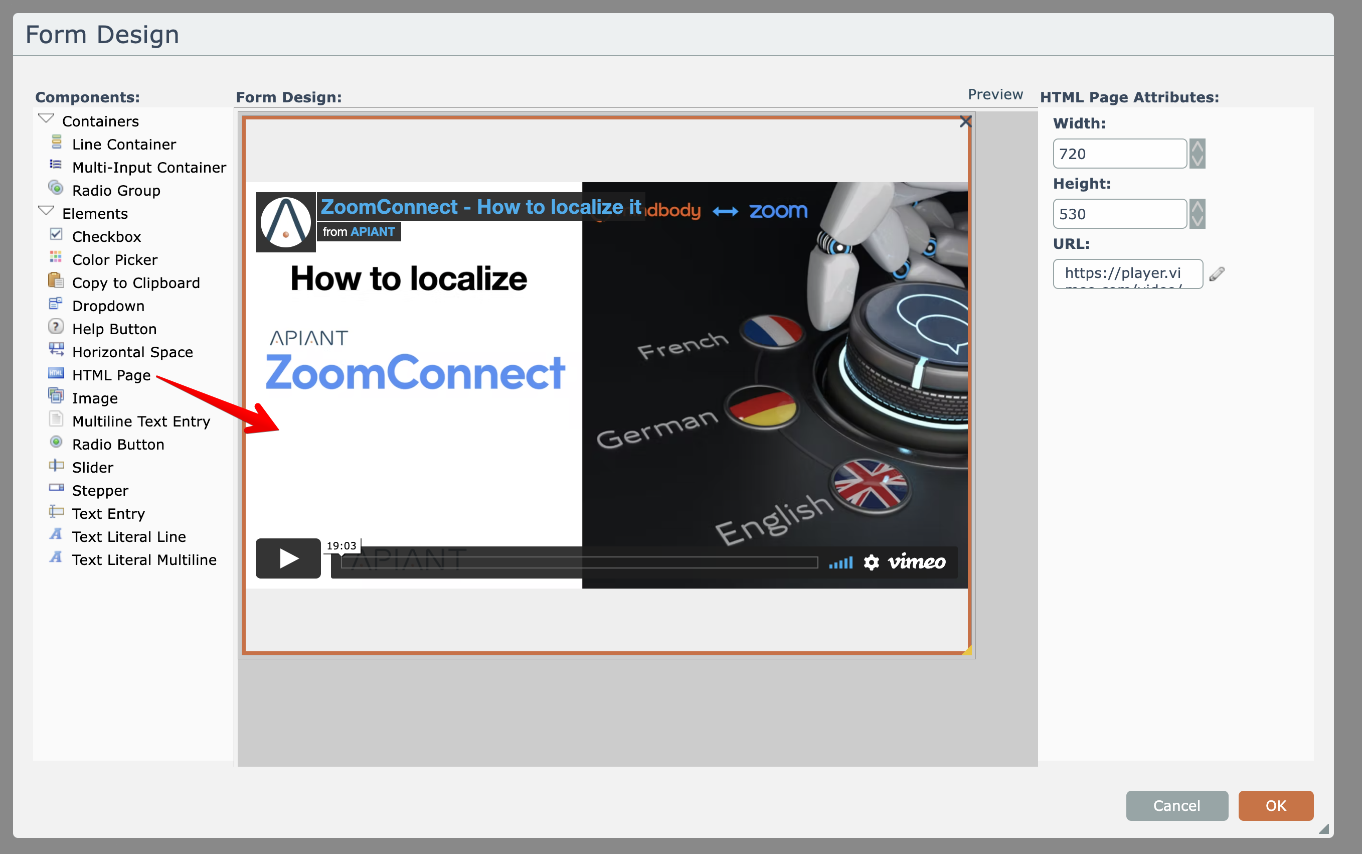 The HTML Page element can render frameable content such as a web page, animated gif, or video: