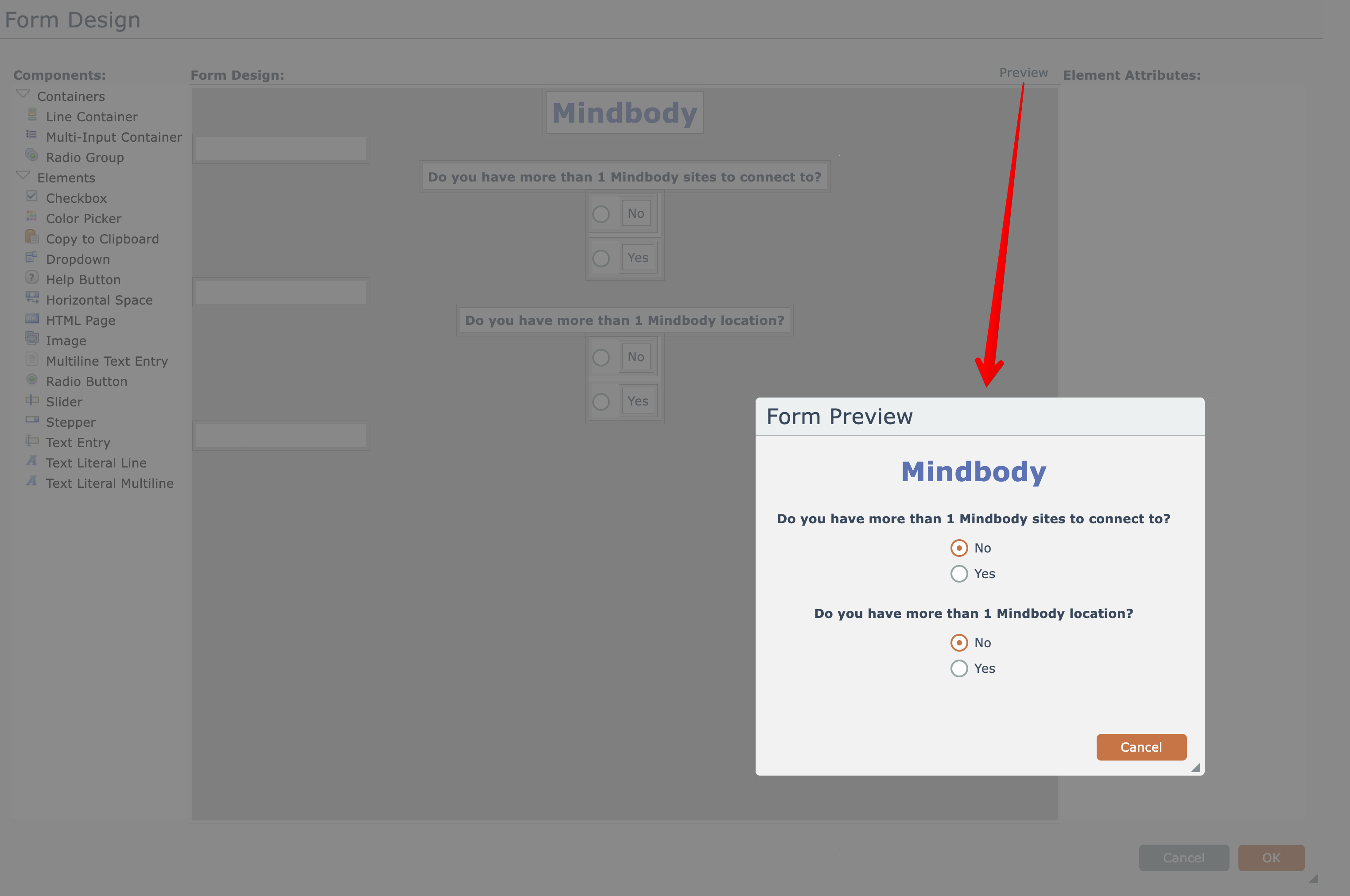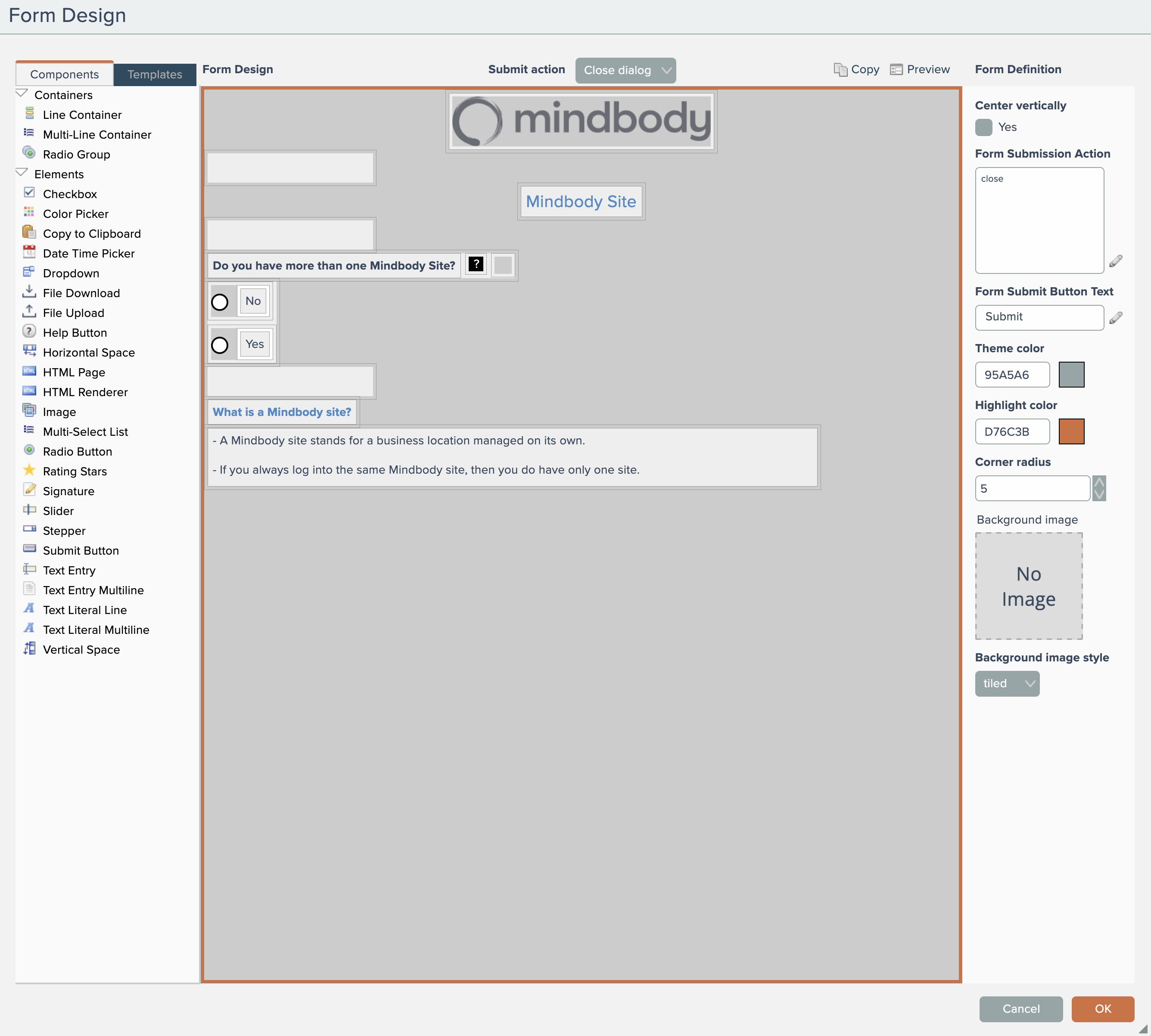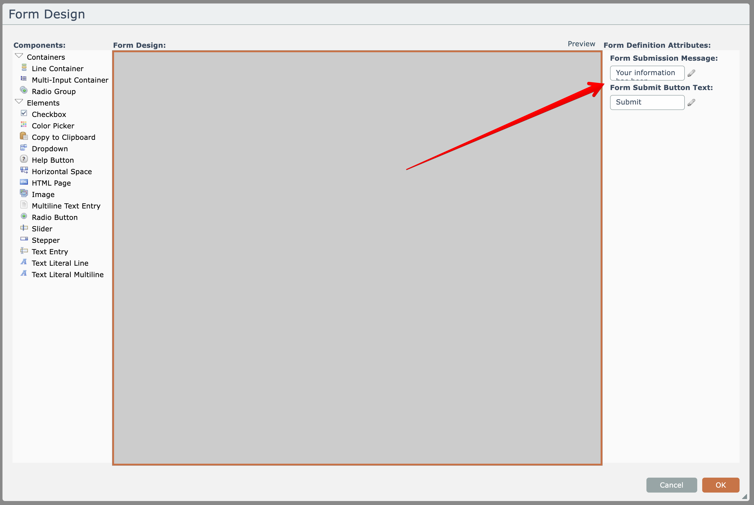 Clicking a container or an element in the design will show that item's attributes on the right side. The design area itself that represents the overall form has attributes for controlling the form submission message text and the text of the default form submit button. Click the form design background to select it and show its attributes: