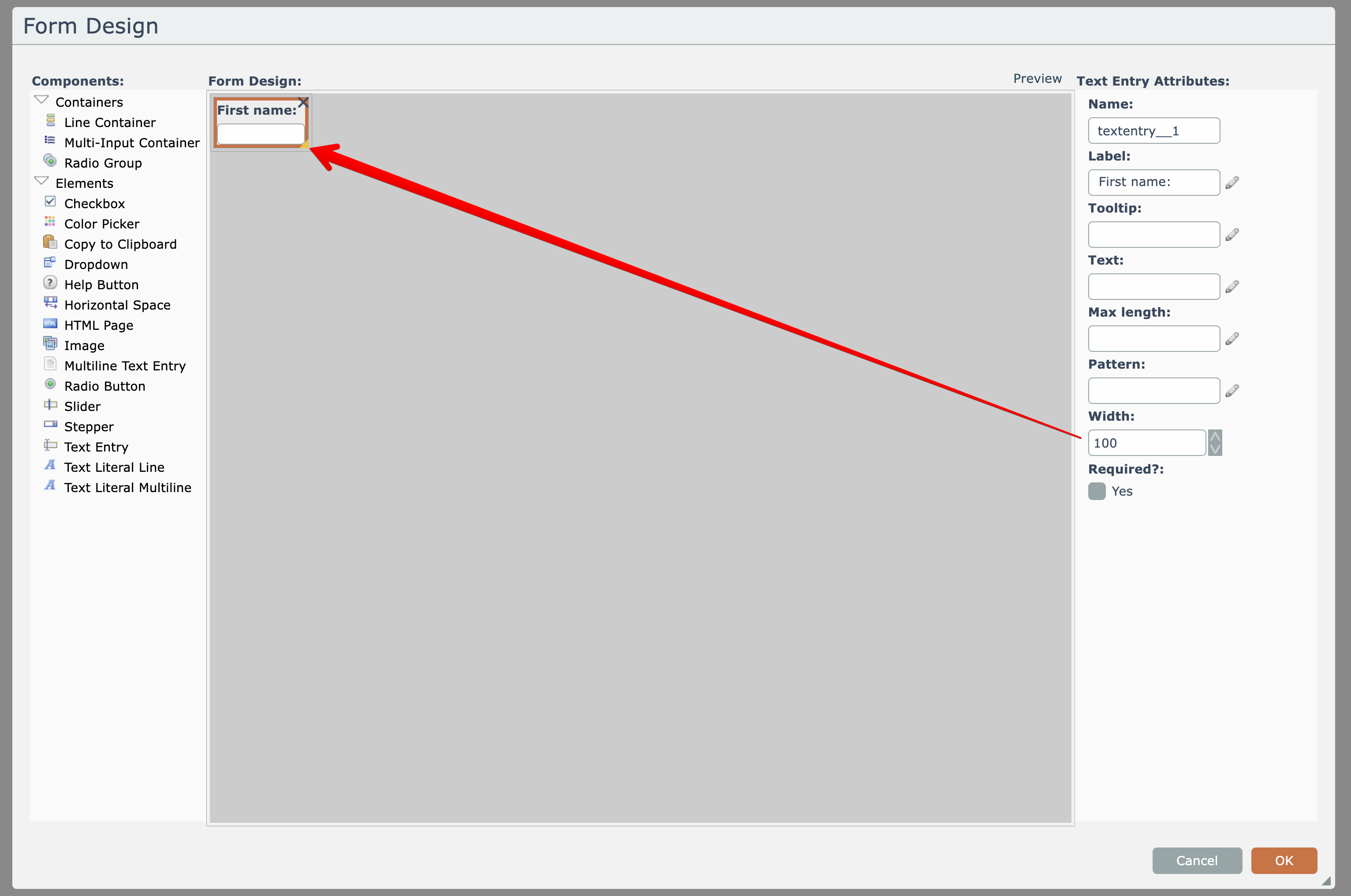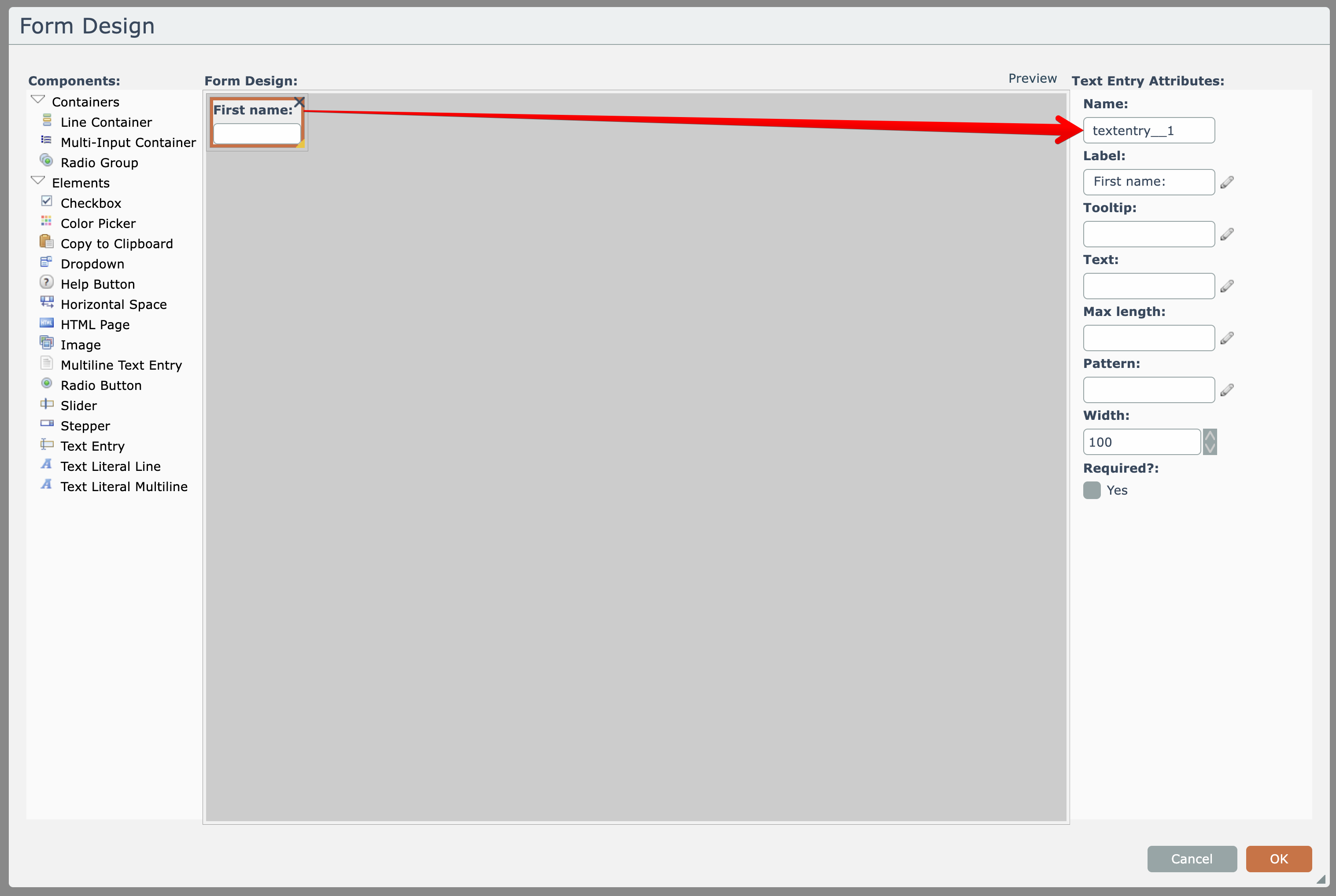 Elements have an attribute for their names. All element names must be unique within a form. The designer will auto-generate a unique name when an element is placed into the design. Generally you will want to rename elements that receive input so you can easily identify them within the automation. In the below case, this field is best renamed to "first_name":