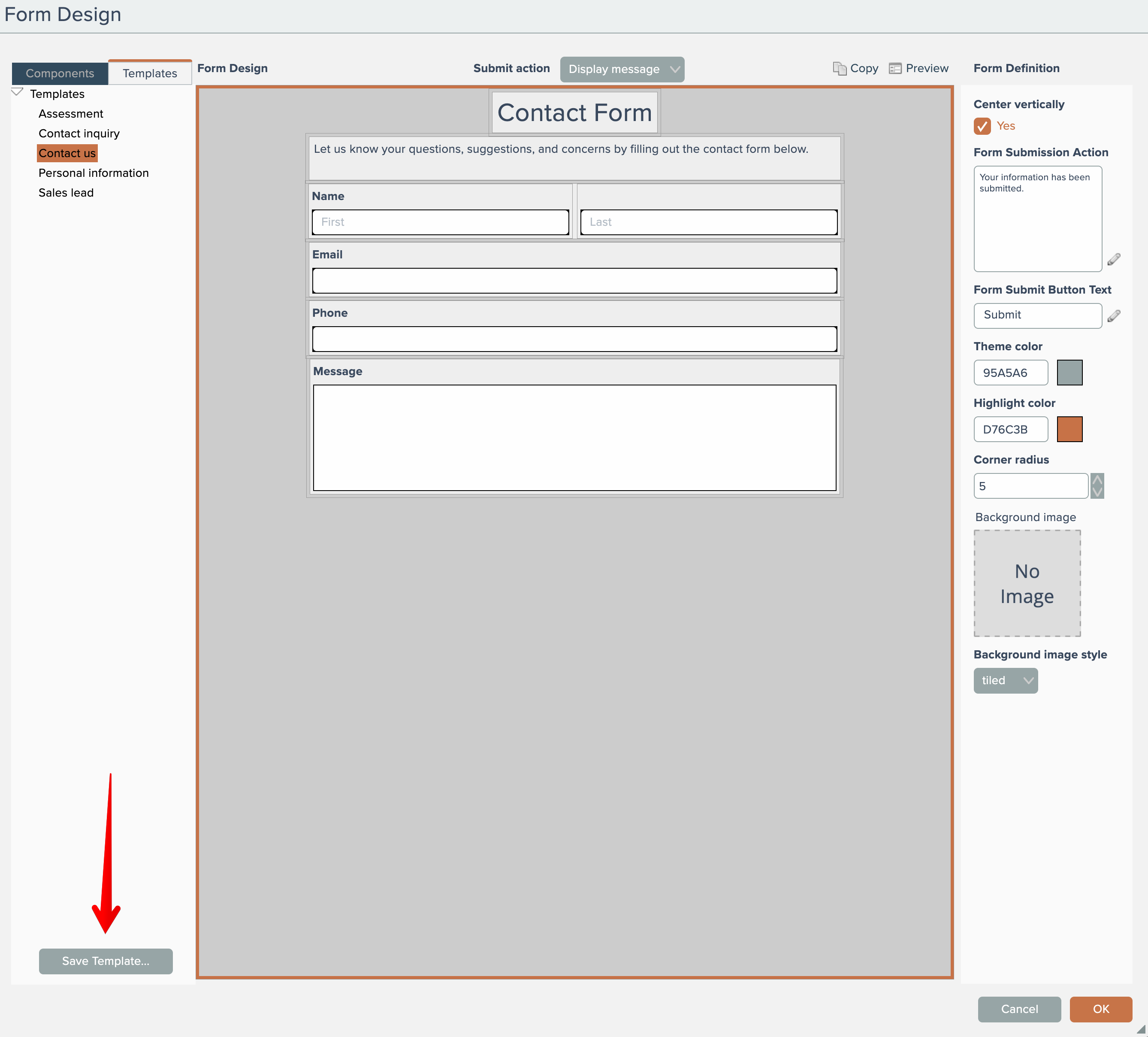 You can save your own form template designs. Click the Save Template button at the bottom left: