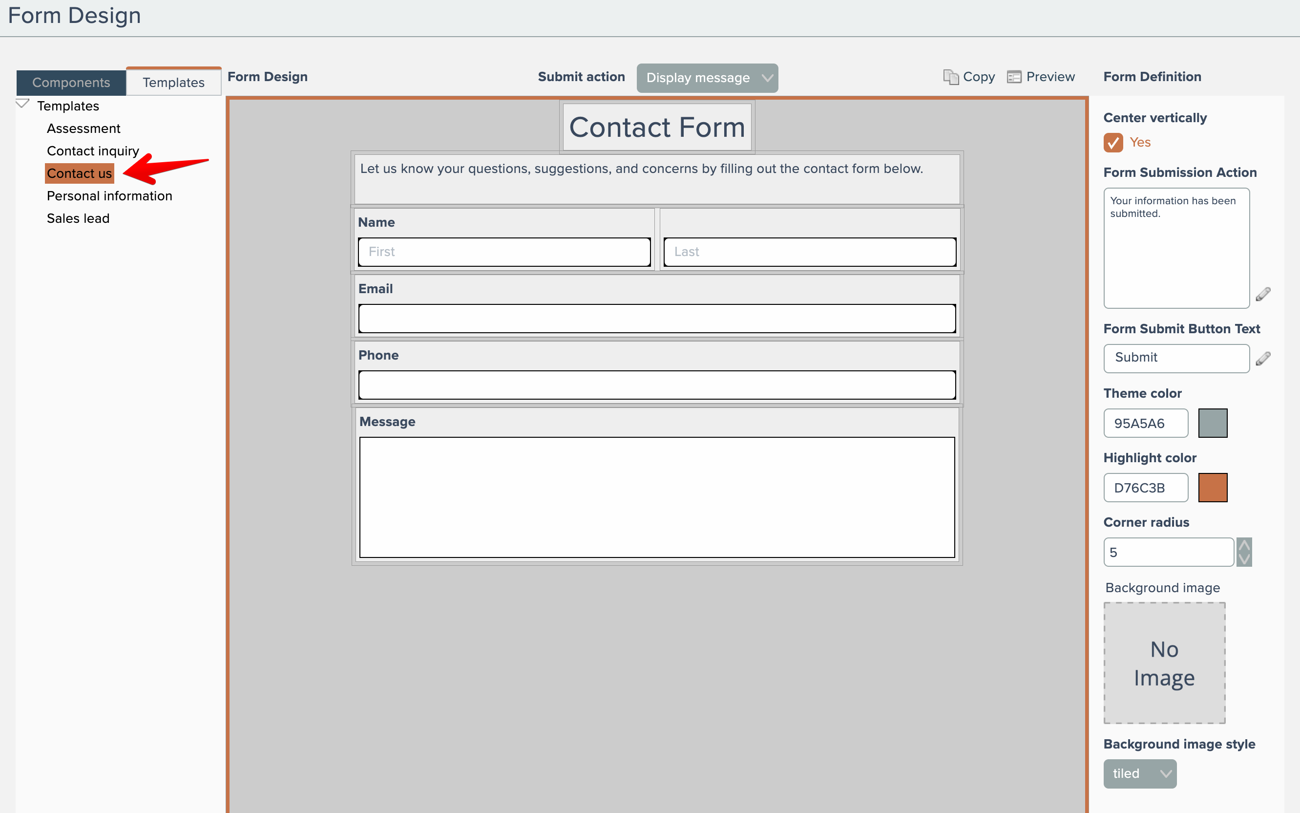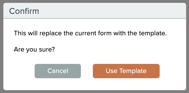 Opening a template will replace the entire design in the editor. If you already have a design loaded, the editor will confirm that you want to replace the existing form design with the selected template: