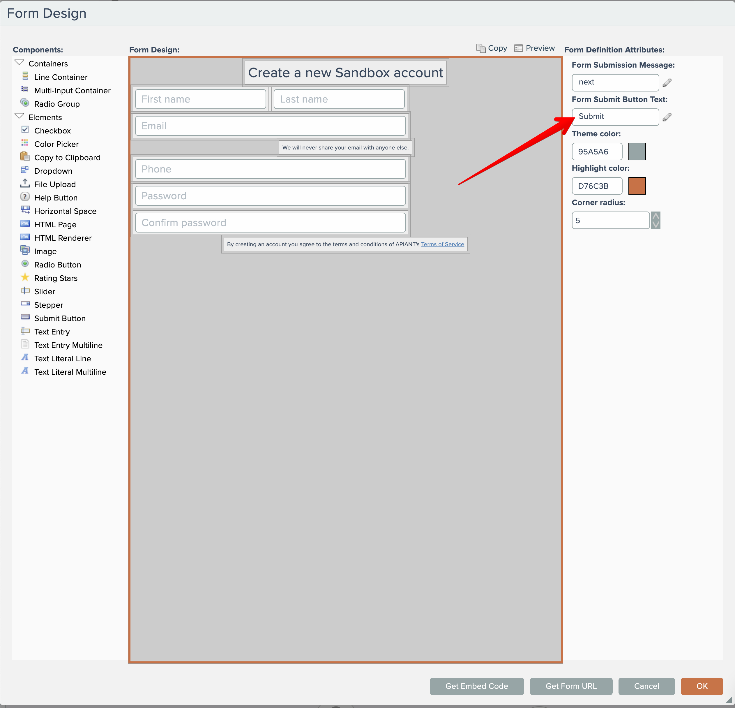 The default Submit button will inherit the Highlight Color, also configured in the form's attributes shown above.
