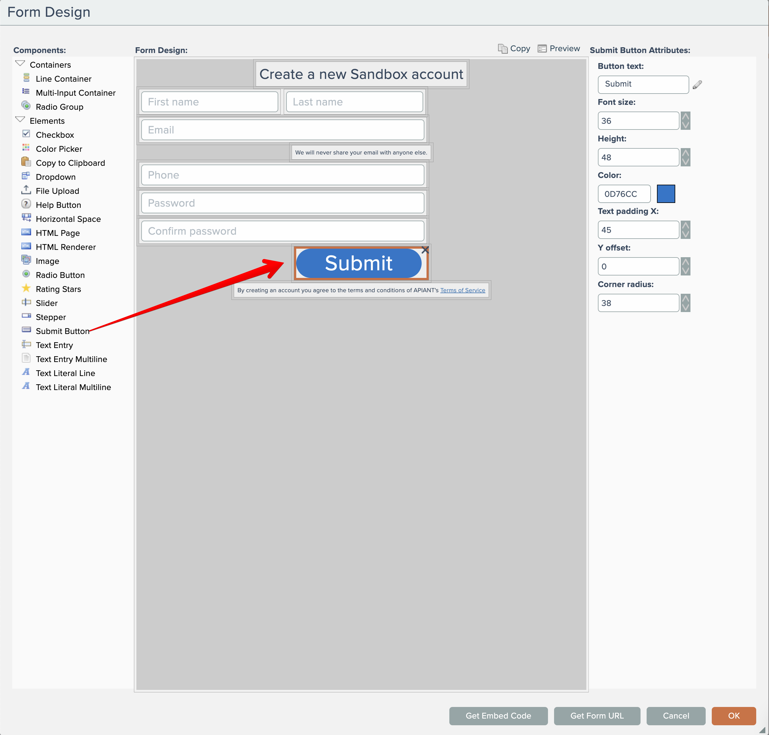 Click the form design background to edit the text of the default Submit button: